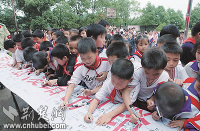 圖為鄂州市桐城小學(xué)學(xué)生踴躍簽名爭(zhēng)做遵守交通法規(guī)好學(xué)生。