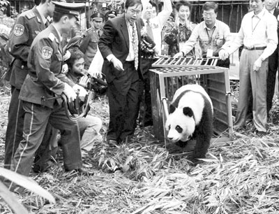 荊楚網(wǎng)消息(楚天都市報)一只野生大熊貓日前闖入四川省都江堰鬧市(本報曾予報道),被當(dāng)?shù)亓謽I(yè)部門營救,并被送往臥龍自然保護(hù)區(qū)療養(yǎng)。8月8日,戴有GPS衛(wèi)星定位儀器的大熊貓被放歸都江堰龍溪虹口國家自然保護(hù)區(qū)。當(dāng)天,它沒說拜拜就踏出鐵籠走入密林,前后不到10秒鐘。科研人員在今后一年多的時間內(nèi),將對它進(jìn)行定位跟蹤,這有助于科學(xué)家進(jìn)一步了解和掌握大熊貓野外生活習(xí)性和活動規(guī)律。(新華社發(fā))