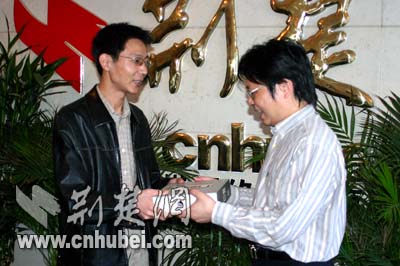 荊楚網(wǎng)副總編輯黃斌給從松滋趕來(lái)領(lǐng)獎(jiǎng)的牟先生發(fā)獎(jiǎng)