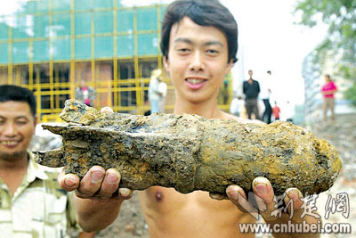 民工王先生說,他們挖坑時,鐵鍬突然碰到一個硬東西,扒出一看,竟然是個“啞”炮。隨后,他們又在旁邊挖出一些人的尸骨。