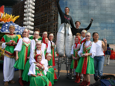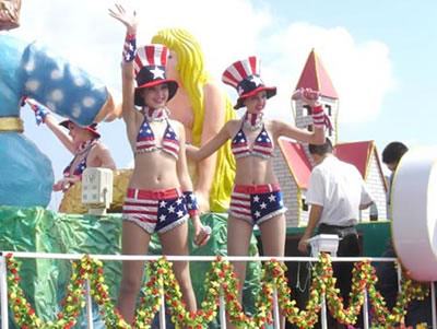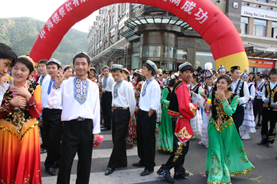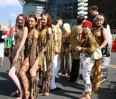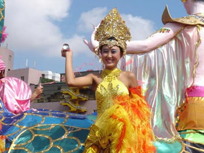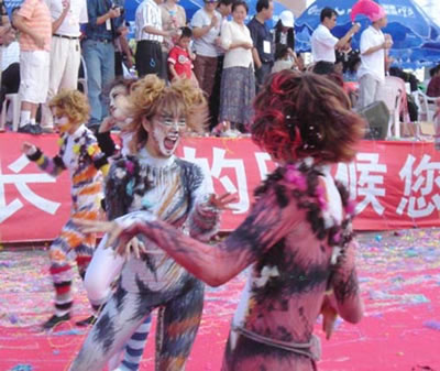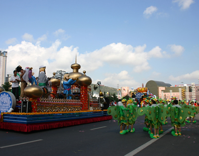 今天上午在新海廣場舉行的第六屆大連狂歡節(jié),更是使歡樂的海洋里掀起了歡樂的海潮。來自國內(nèi)外的24支狂歡巡游隊伍,以花團錦簇的民族服裝和極度夸張的藝術(shù)手法,演繹了航天、花神、特洛伊木馬、梁山伯與祝英臺、孔雀仙子、海底動物、蝴蝶服飾、阿凡提、醉酒、美人魚、回娘家、貓友、豪華游覽馬車、日月潭傳說、堂吉訶德、木偶奇遇、狐假虎威、寶蓮燈、海娃與王子、小櫻丸子、尼爾斯騎鵝記、阿里巴巴、輪滑表演等國內(nèi)外著名童話,電影故事等。最為耀眼的是以音樂劇《貓》的扮相出場的表演隊伍,他們獨特的表演和造型贏得了在場觀眾最多的歡呼聲?駳g的服裝藝術(shù)巡游,吸引了數(shù)萬國內(nèi)外游客和當(dāng)?shù)孛癖姷挠^賞。