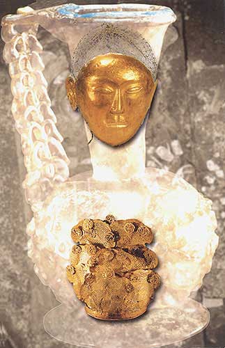 連綴銀絲網(wǎng)絡(luò)金面具:斂葬用具(上,面具長21.7厘米)