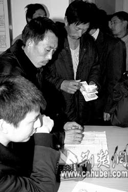 荊門(mén)麻城鎮(zhèn)譚珍國(guó)等農(nóng)民工,在天門(mén)市勞動(dòng)保障監(jiān)察大隊(duì)領(lǐng)取用人單位所欠的工資款(上圖)。去年12月以來(lái),天門(mén)市組織有關(guān)職能部門(mén)對(duì)全市37家用人單位支付農(nóng)民工工資情況進(jìn)行專(zhuān)項(xiàng)檢查,共查出6家用人單位拖欠農(nóng)民工工資,他們及時(shí)為2056名農(nóng)民工追回工資180余萬(wàn)元(下圖)。(特約記者肖金舫通訊員劉銀斌攝)