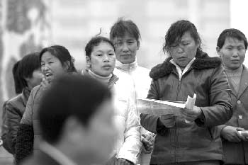 在武漢2007春季首場(chǎng)農(nóng)民工招聘會(huì)上,幾位來自黃梅的農(nóng)民工在私下討論:“今年招工才剛開始,要先比較哪家更好!