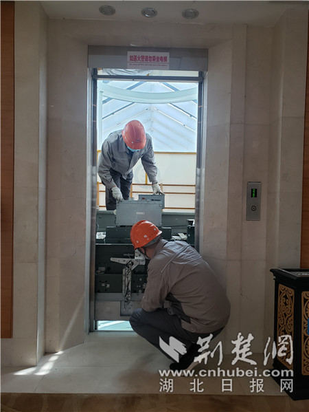 檢驗(yàn)員對(duì)東湖賓館的電梯進(jìn)行細(xì)致檢驗(yàn)。