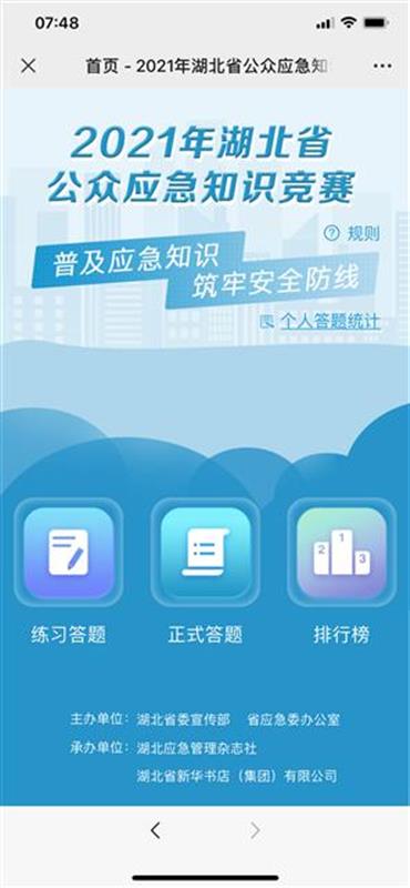 據(jù)了解,湖北省委宣傳部、湖北省突發(fā)事件應(yīng)急管理委員會辦公室聯(lián)合發(fā)起2021年湖北省公眾應(yīng)急知識競賽活動。此次活動旨在深入貫徹落實《中共湖北省委宣傳部、湖北省突發(fā)事件應(yīng)急管理委員會辦公室關(guān)于廣泛學(xué)習(xí)宣傳和深入普及公眾應(yīng)急知識的通知》要求,更好地提升全民應(yīng)急素質(zhì),在全社會形成人人知安全風(fēng)險、人人樹風(fēng)險意識、人人筑安全基礎(chǔ)的良好氛圍。