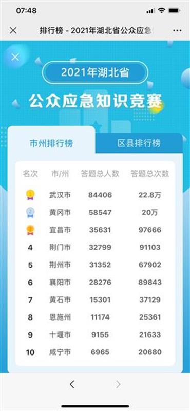 湖北省應(yīng)急知識競賽答題活動于5月8日正式開賽,截至當(dāng)日17時,參與人數(shù)突破23.3萬人,答題總次數(shù)超62萬次。