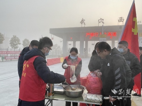 在武穴西收費站,收費員配合協(xié)助地方做好疫情防控工作的同時,為往來司乘送上一碗碗熱騰騰的面條。( 通訊員黃利文、吳輝、張溪)
