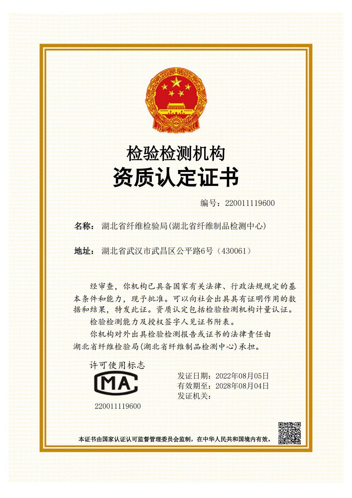 國家非織造布產(chǎn)品質量檢驗檢測中心(湖北)(籌)獲得國家級資質認定證書