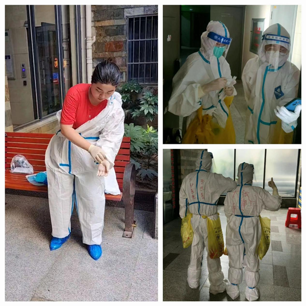 原來,自8月11日0時(shí)起,陽光棲谷小區(qū)實(shí)行嚴(yán)格的封控管理,需要進(jìn)行多輪全員核酸檢測(cè)。為提高核酸檢測(cè)采樣效率,需要在每個(gè)樓棟內(nèi)招募志愿者協(xié)助醫(yī)護(hù)人員作業(yè)。“我是醫(yī)務(wù)工作者我可以!”得知消息后,住在6號(hào)樓的九三學(xué)社社員、太和醫(yī)院康復(fù)前移科醫(yī)生李中英主動(dòng)請(qǐng)纓,毫不猶豫地就地上崗。連日來,每次核酸檢測(cè)采樣完畢,脫掉防護(hù)服,李中英都是滿臉通紅、汗流浹背,雙手被橡膠手套里的汗水泡得發(fā)皺發(fā)白?!拔沂且幻t(yī)務(wù)工作者,這是我應(yīng)盡的職責(zé),疫情面前,自己是業(yè)主,也是志愿者,要帶頭沖鋒在一線”。李中英說。