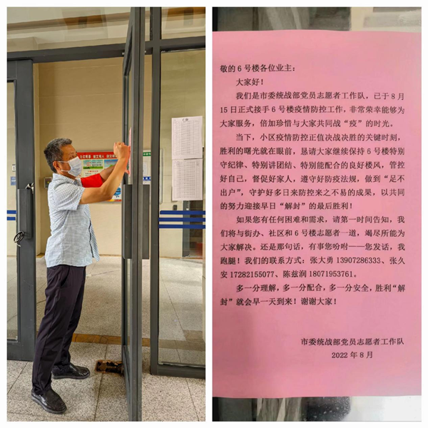“守好門”是統(tǒng)戰(zhàn)突擊隊(duì)的首要任務(wù)。“我先生要去太和醫(yī)院做透析,手機(jī)里只有社區(qū)發(fā)過來的通行證照片,我們可以出去嗎?”8月17日7點(diǎn)10分,市委統(tǒng)戰(zhàn)部駐守的6號(hào)樓業(yè)主王女士向突擊隊(duì)員張久安電話求助。在查驗(yàn)身份證、健康碼、核酸檢測(cè)結(jié)果并向社區(qū)核實(shí)后,張久安才準(zhǔn)予放行。