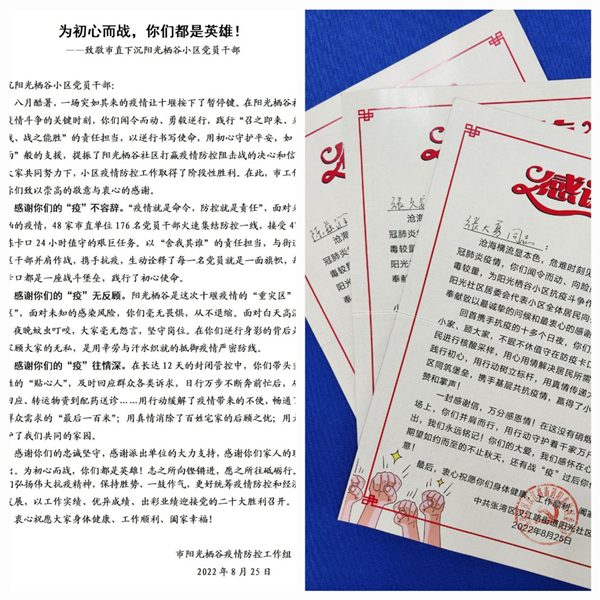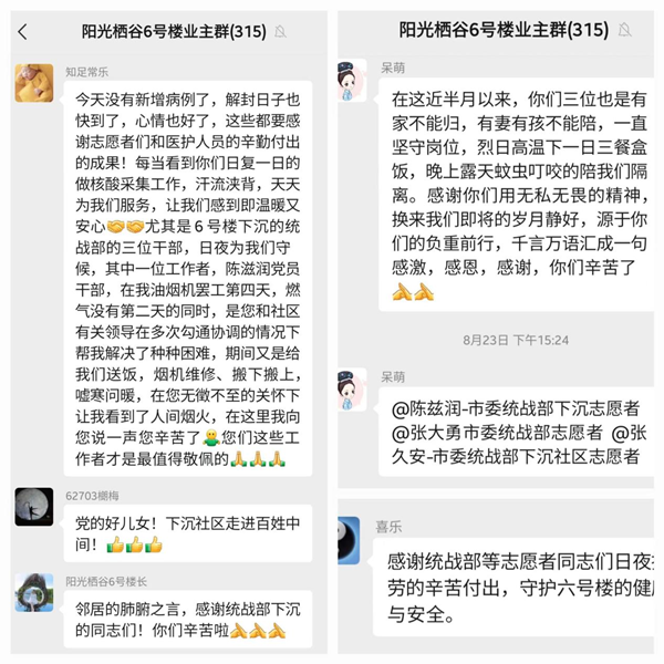 “服好務(wù)”是統(tǒng)戰(zhàn)突擊隊(duì)的使命擔(dān)當(dāng)?!霸谀鸁o微不至的關(guān)心下讓我看到了人間煙火,在這里我向您說一聲辛苦了!”8月23日下午,市委統(tǒng)戰(zhàn)部駐守的6號(hào)樓業(yè)主龔先生對(duì)突擊隊(duì)員陳茲潤滿是感激。他家油煙機(jī)壞了4天,燃?xì)馇焚M(fèi)停氣2天,由于封控管理,吃飯成了難題。市委統(tǒng)戰(zhàn)部突擊隊(duì)獲悉后,多方協(xié)調(diào)爭(zhēng)取,僅半天時(shí)間就幫他家充足了燃?xì)?,修好了油煙機(jī)。