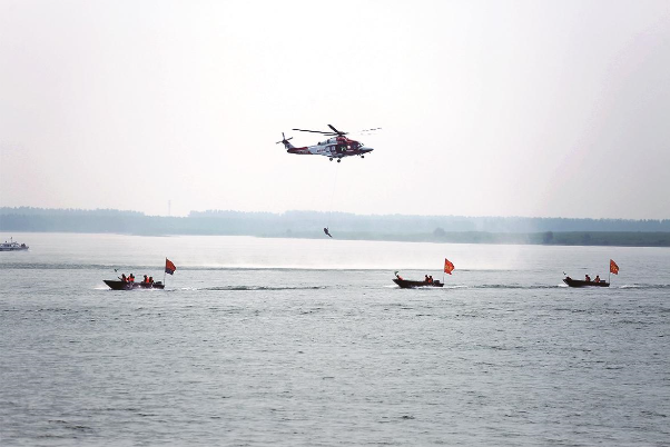 石首長(zhǎng)江防汛搶險(xiǎn)綜合演練,開展直升機(jī)水域救援。