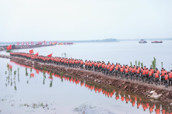 長(zhǎng)江防汛搶險(xiǎn)綜合演練現(xiàn)場(chǎng),武警官兵前往險(xiǎn)情位置進(jìn)行處置。