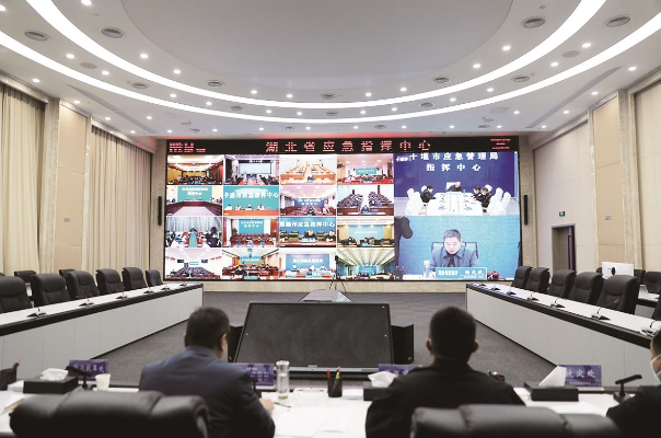 湖北省應(yīng)急管理廳應(yīng)急指揮中心,通過視頻連線各級(jí)應(yīng)急指揮中心和救援隊(duì)伍。