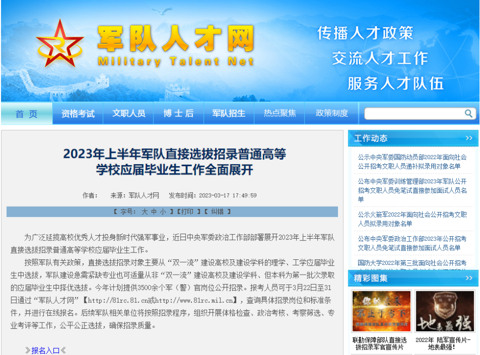 3月22日至3月31日在“軍隊人才網(wǎng)”(http://81rc.81.cn)查詢具體招錄崗位和標(biāo)準(zhǔn)條件,并進(jìn)行在線報名!