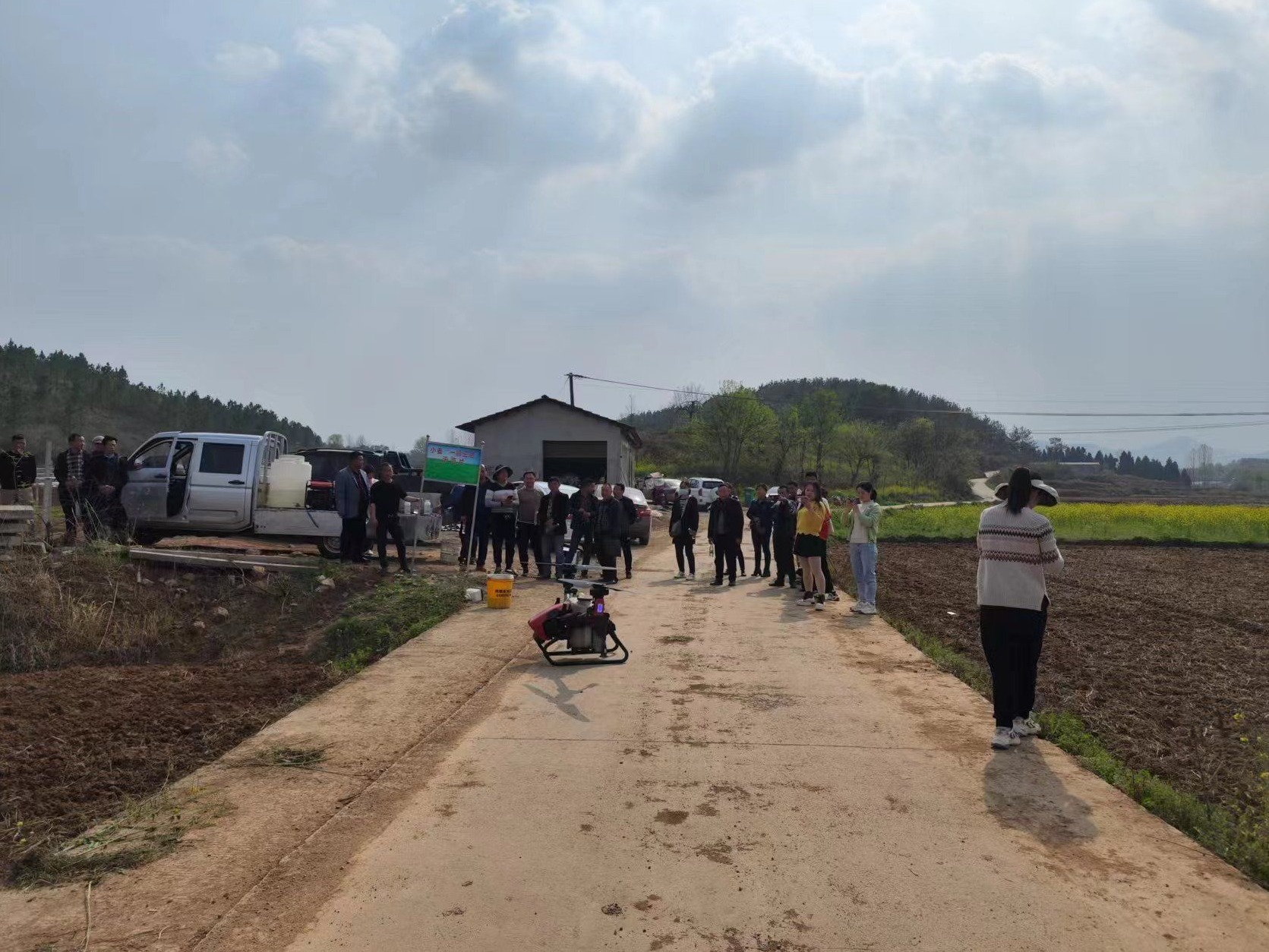 圖為:無人機(jī)操作員遙控指揮飛機(jī)噴施農(nóng)藥