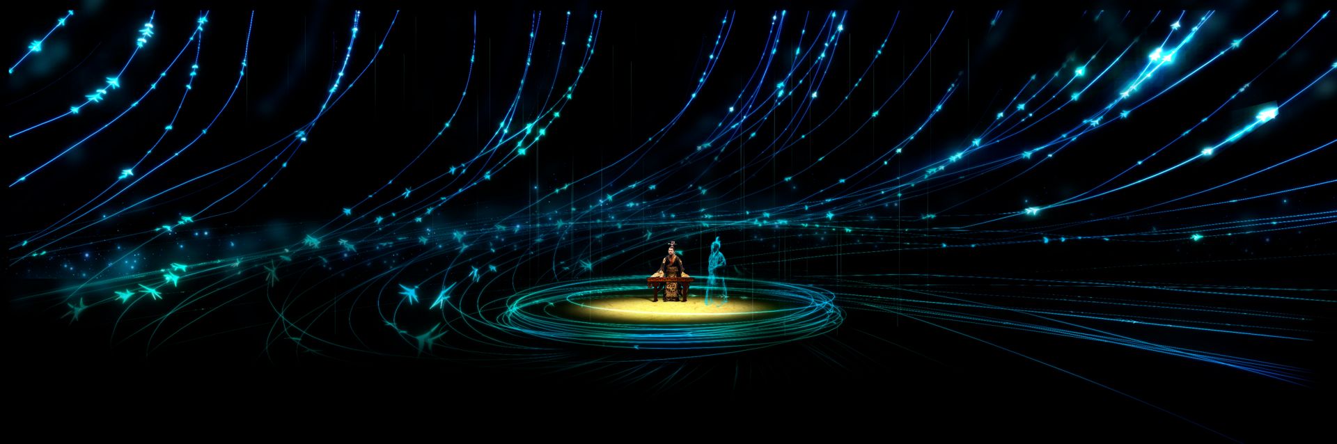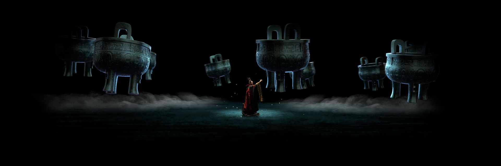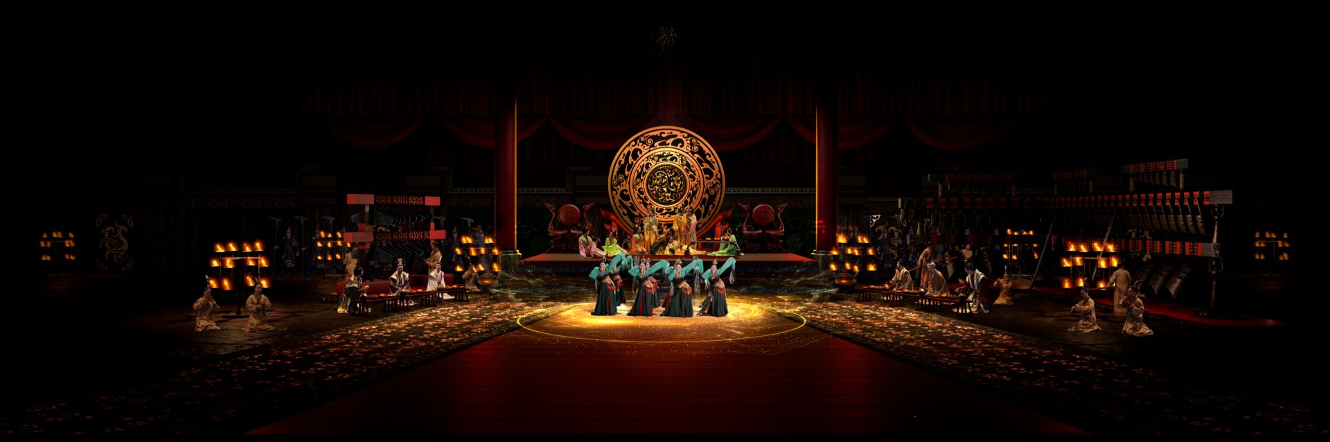 久遠(yuǎn)的歷史,因全息舞臺(tái)凸顯出強(qiáng)大藝術(shù)感染力。楚巫的神秘,楚舞的優(yōu)雅,楚歌的委婉,匯聚成楚文化的動(dòng)人魅力。楚國將士金戈鐵馬,楚宮歌女身姿婀娜,火神鳳凰神奇夢幻。經(jīng)過3D建模后呈現(xiàn)的編鐘、虎座鳳架鼓和楚劍等楚文化代表性文物極具視覺沖擊力。