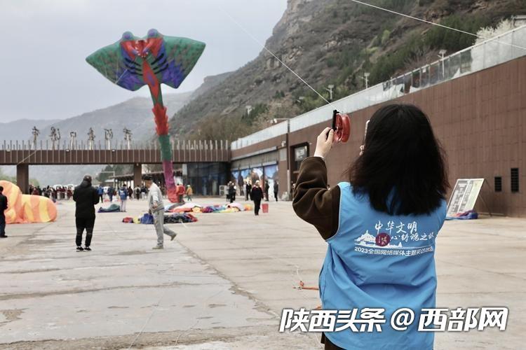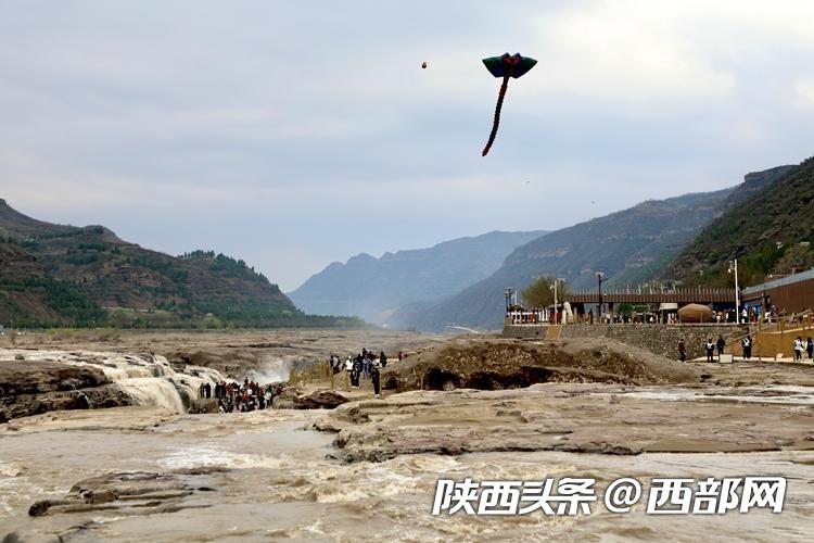 媒體記者在壺口瀑布岸邊體驗(yàn)放風(fēng)箏。