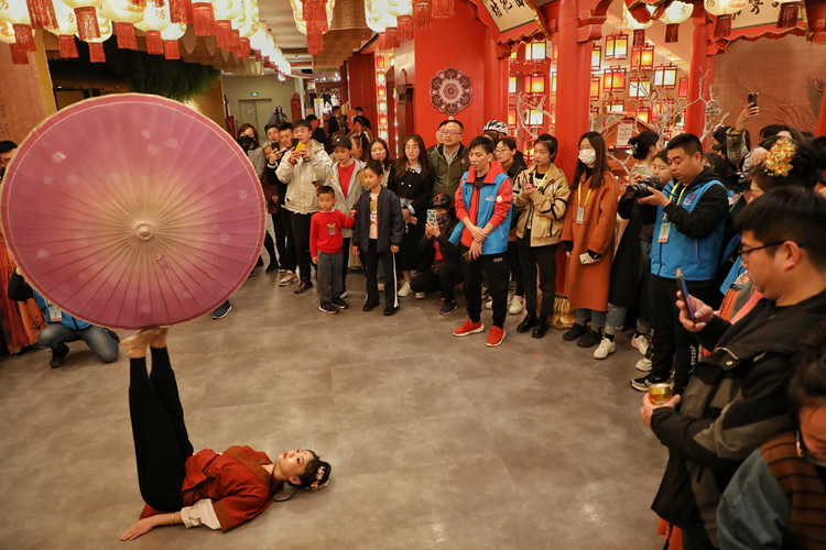 “長安十二時辰”主題街區(qū)內(nèi),NPC在街邊表演節(jié)目。