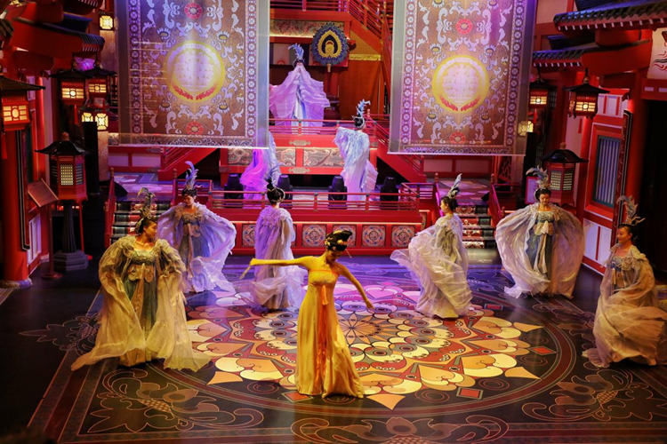 豐富的唐風立體裝飾營造出強烈的視覺沖擊力,給人一種獨特的審美體驗,公共演藝平臺更是將唐長安各色曲藝舞蹈集中呈現(xiàn)。在“花舞大唐”舞臺上,將上演霓裳羽衣舞、凌波舞等演藝,再現(xiàn)繁華長安的舞蹈曲藝魅力。從宮廷到民間,自舞蹈至曲藝,各色唐代藝術(shù)集萃于這一舞臺,組合成一場精彩的唐長安視聽盛宴。