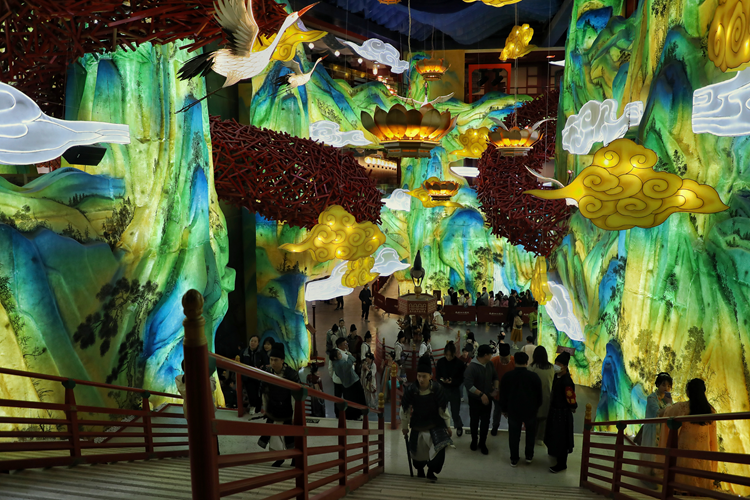 一層是以“和合之美·風雅長安”為主題的唐風主題互娛休閑空間,這里衣香袂影,霓裳起舞,在南北中庭公共區(qū)域的三大舞臺,唐朝仕女身著飄逸襦裙,演藝霓裳羽衣舞、春江花月夜、秦王點兵、凌波舞、踏搖娘、公孫劍舞等特色演出,將“衣香袂影是盛唐”的場景完美呈現(xiàn)。