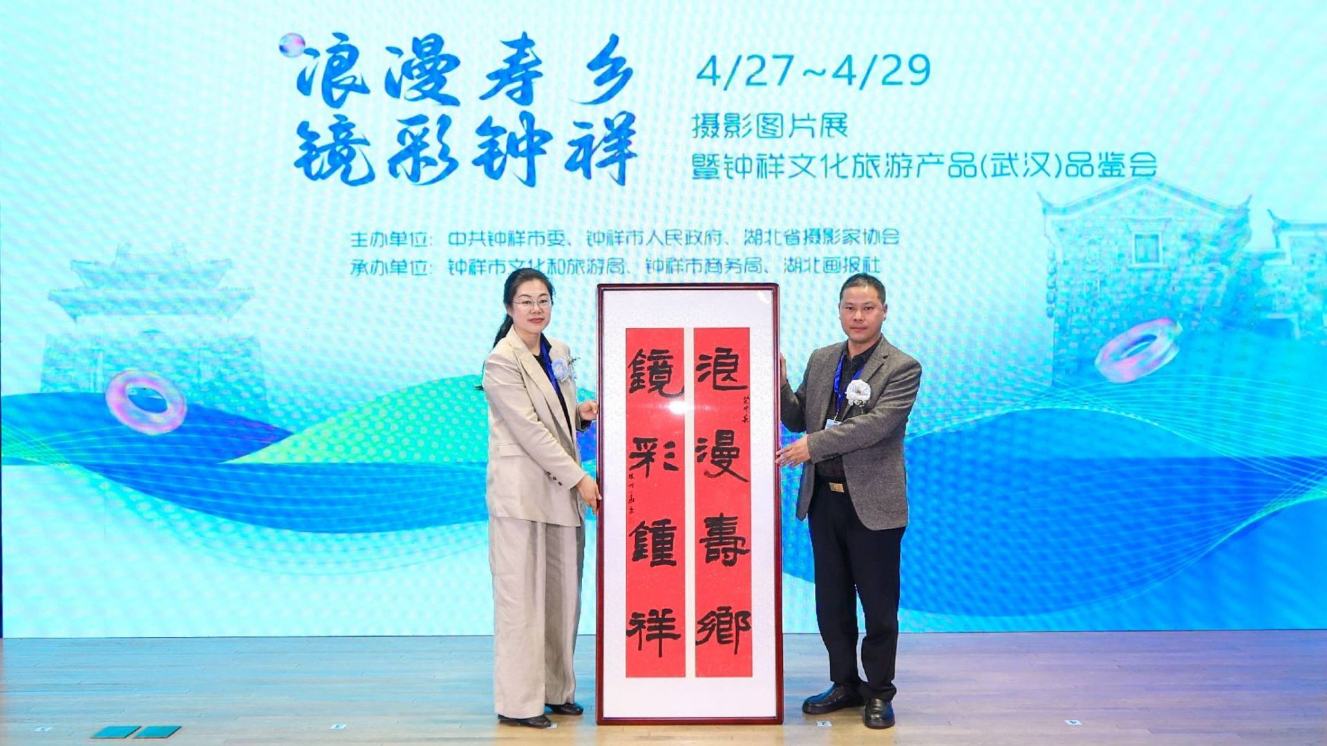 隨后,中國書法家協(xié)會會員、湖北畫報社董事長陳明華向鐘祥市文旅局局長郭慶贈送書法作品《浪漫壽鄉(xiāng) 鏡彩鐘祥》,蒼勁有力、飄逸自如的作品,寫盡了長壽鐘祥的詩意浪漫。