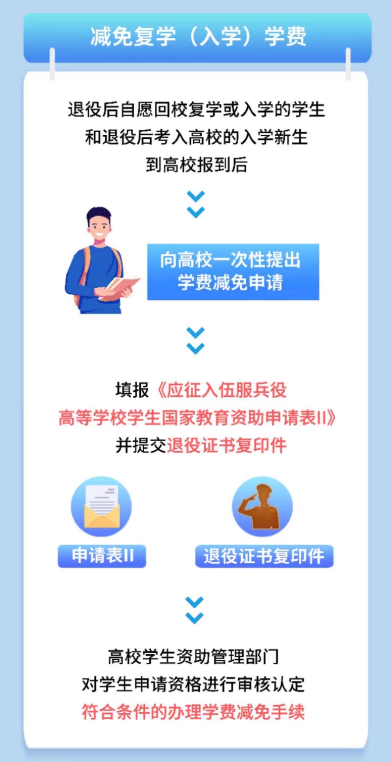 ③ 對退役后,自主就業(yè),通過全國統(tǒng)一高考或高職分類招考方式考入高等學(xué)校并到校報到的入學(xué)新生,實(shí)行學(xué)費(fèi)減免。
