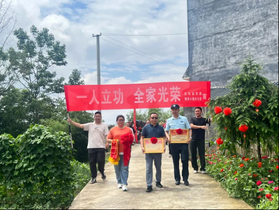 一人立功,全家光榮。現(xiàn)場(chǎng),送喜報(bào)的工作人員為張森華和家人佩戴光榮綬帶戴上大紅花、送上立功喜報(bào)?!袄瞎闶俏覀円患业尿湴?,以后你守護(hù)國(guó)家,我守護(hù)小家,我是你最堅(jiān)強(qiáng)的后盾?!毙禄槠拮訁潜徃吲d的說(shuō)道。