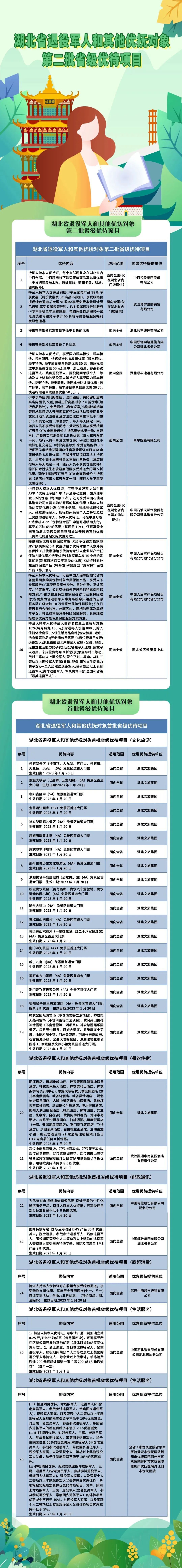 今年1月9日,湖北省退役軍人事務(wù)廳與中國電信湖北分公司、中國郵政湖北分公司、中石化湖北石油分公司、湖北文化旅游集團(tuán)有限公司、武漢中商超市連鎖有限公司、武漢融通中南花園酒店有限責(zé)任公司6家單位簽訂擁軍優(yōu)撫合作協(xié)議,推出全省首批省級優(yōu)待項目。3月14日,湖北省退役軍人事務(wù)廳聯(lián)合省文旅廳、湖北文旅集團(tuán)面向全國、全省退役軍人發(fā)布首批主題賞花路線、主題紅色路線、主題踏青路線、主題經(jīng)典春游路線等文旅優(yōu)待項目,讓廣大退役軍人實現(xiàn)一部手機(jī)游湖北。