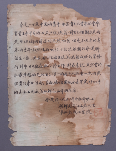 1951年抗美援朝志愿軍戰(zhàn)士在朝鮮前線寫下的帶血請(qǐng)戰(zhàn)書(shū)。