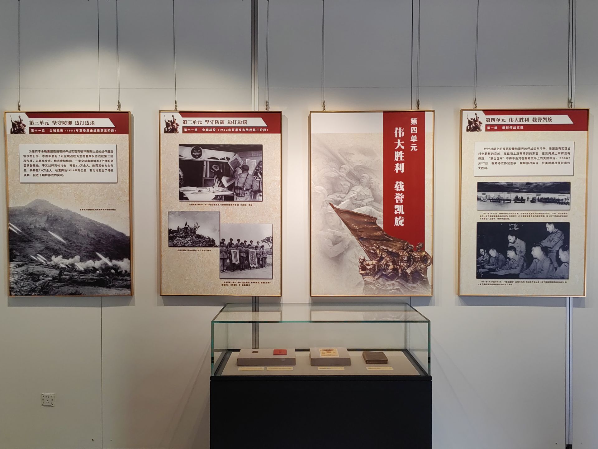 第三單元“堅(jiān)守防御 邊打邊談”,重點(diǎn)介紹了從1951年6月中旬至1953年7月27日這一階段,志愿軍以“充分準(zhǔn)備持久作戰(zhàn)和爭(zhēng)取和談達(dá)到結(jié)束戰(zhàn)爭(zhēng)”為指導(dǎo)方針,以陣地戰(zhàn)為主要作戰(zhàn)形式,依靠堅(jiān)固陣地與敵交戰(zhàn),最終實(shí)現(xiàn)朝鮮停戰(zhàn)。