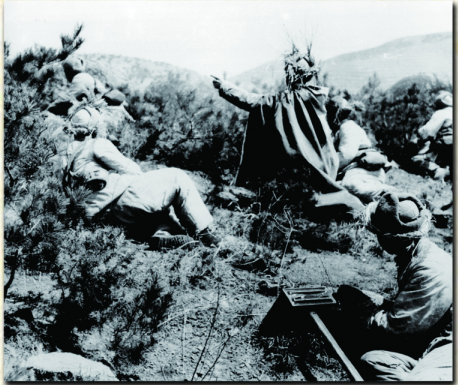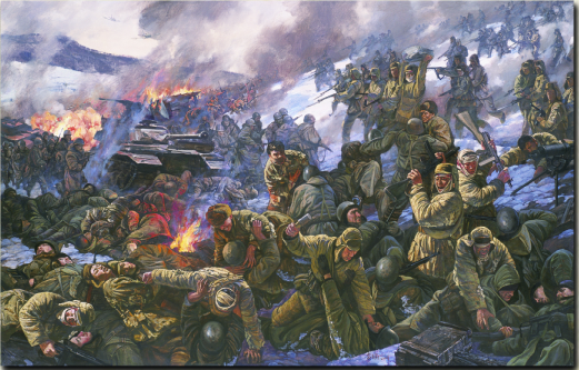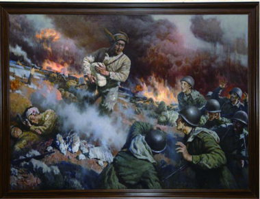 在第二次戰(zhàn)役中,志愿軍第38軍112師335團(tuán)3連在松骨峰與敵遭遇后,在毫無(wú)工事依托的高地上,與蜂擁而來(lái)的美軍頑強(qiáng)激戰(zhàn)。圖為油畫照片:《激戰(zhàn)松骨峰》。