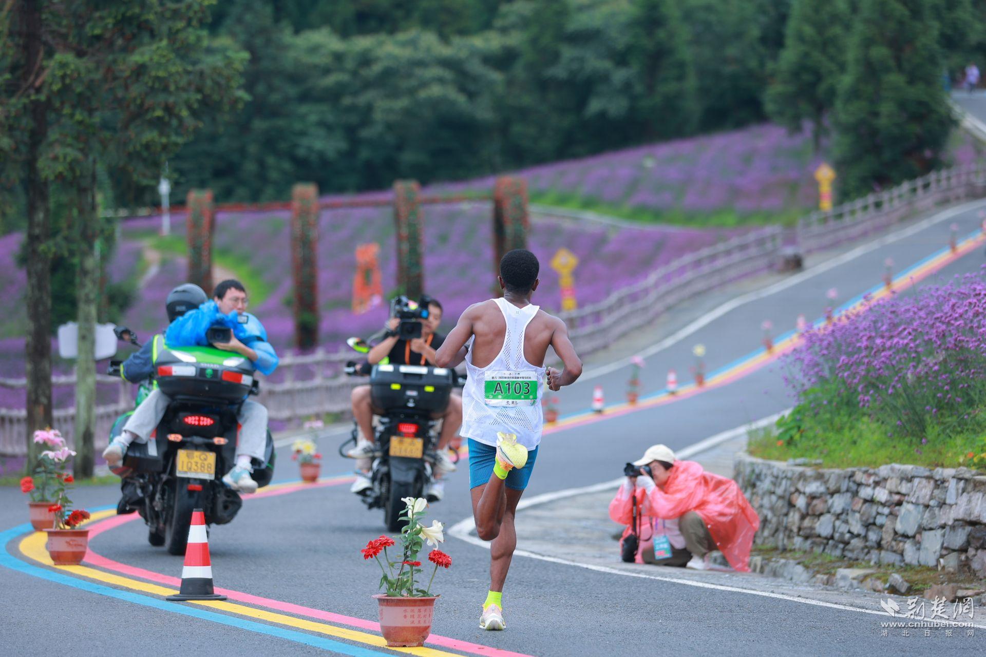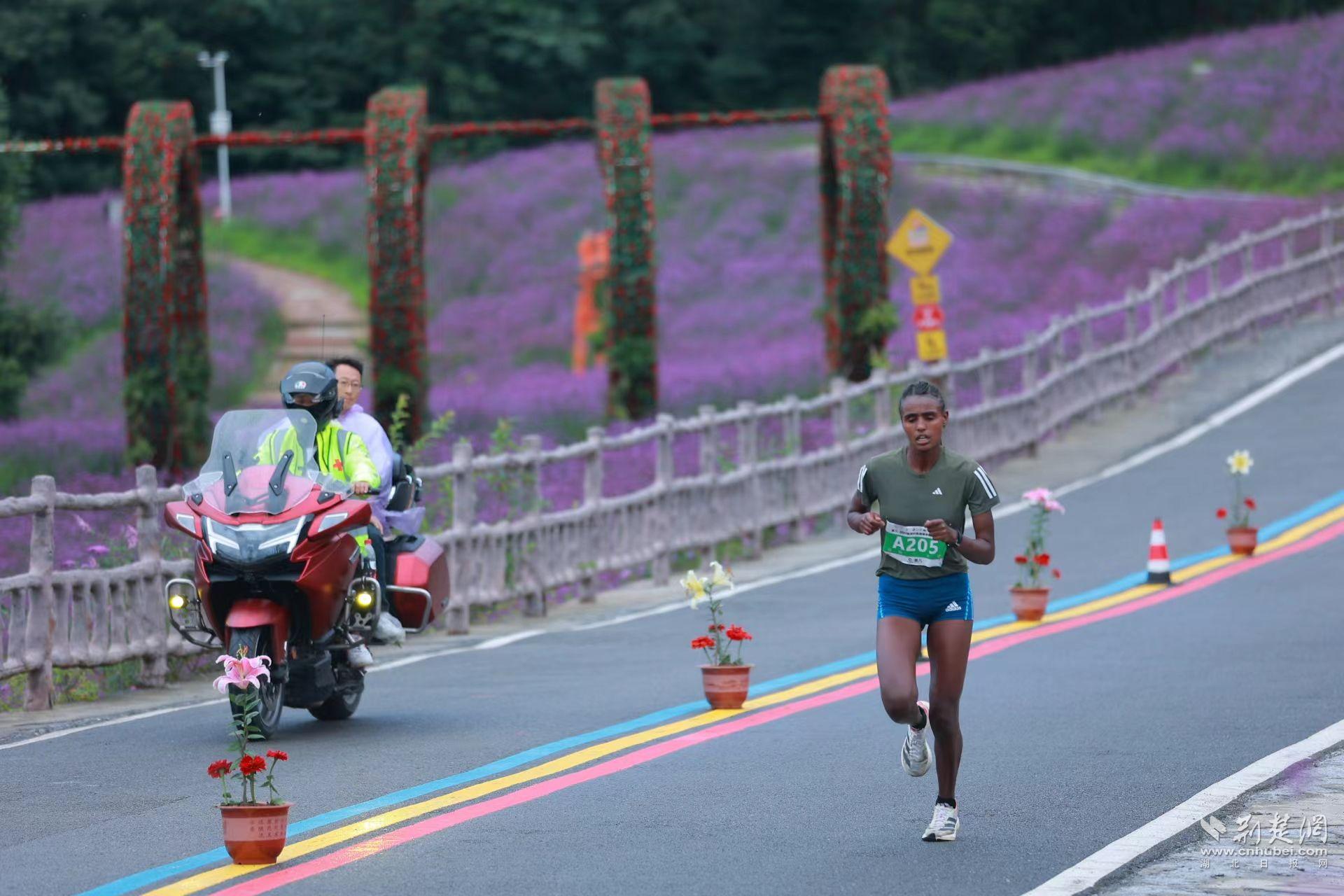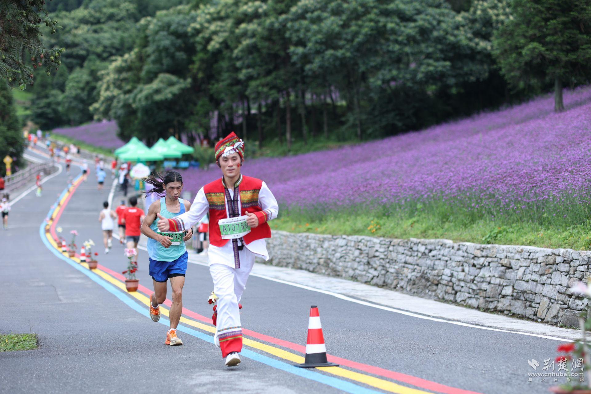 賽事起點(diǎn)位于海拔1100米的野三關(guān)鎮(zhèn)政府,終點(diǎn)位于美麗的野三關(guān)森林花海,海拔1700米,起終點(diǎn)落差600米。一路上,綠樹(shù)成蔭,鮮花為伴,吸引了來(lái)自埃塞俄比亞、肯尼亞、巴基斯坦等國(guó)家的12名國(guó)際友人和來(lái)自全國(guó)各地的參賽選手。他們歡樂(lè)地穿梭在林海與花海中,沖刺在全程爬坡的“最虐”賽道上。