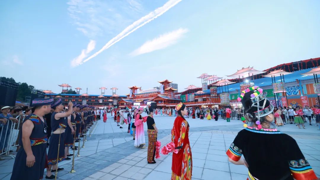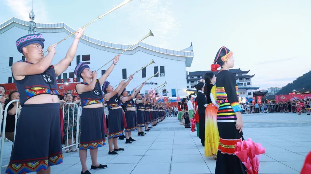 “來客啦!”隨著熱情的吆喝聲,迎賓儀式正式開始。以傳統(tǒng)文化之“禮”,迎遠(yuǎn)道而來之“賓”,迎賓儀式以土苗兒女特有的傳統(tǒng)歌曲、舞蹈等恩施元素和56個(gè)民族代表組成,隆重、喜慶,表達(dá)著恩施作為最年輕的民族自治州的熱情好客,以及在各民族交融中鑄牢中華民族共同體意識(shí)。