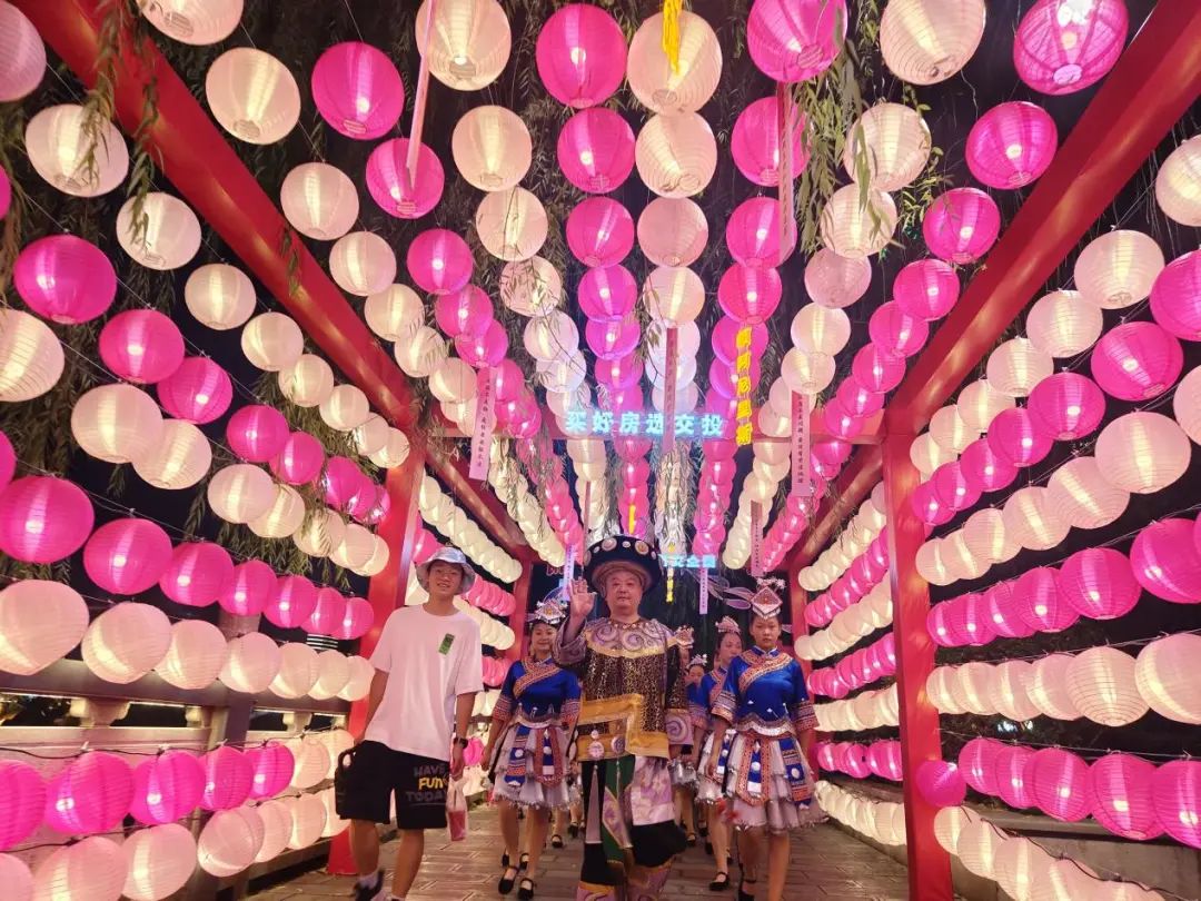 “姑娘們,阿爹帶你們?nèi)ペs場(chǎng)相親,要不要得?”將游客引入傳統(tǒng)土家“趕場(chǎng)相親”情境中,還原舊時(shí)女兒會(huì)“趕場(chǎng)相親”的場(chǎng)景,土司老爺帶著30余名幺妹兒穿梭在“土”味情話(huà)燈展長(zhǎng)廊中,“額阿尼阿次”等土家語(yǔ)情話(huà)躍然進(jìn)入視野,體現(xiàn)了恩施土家族文化的浪漫。