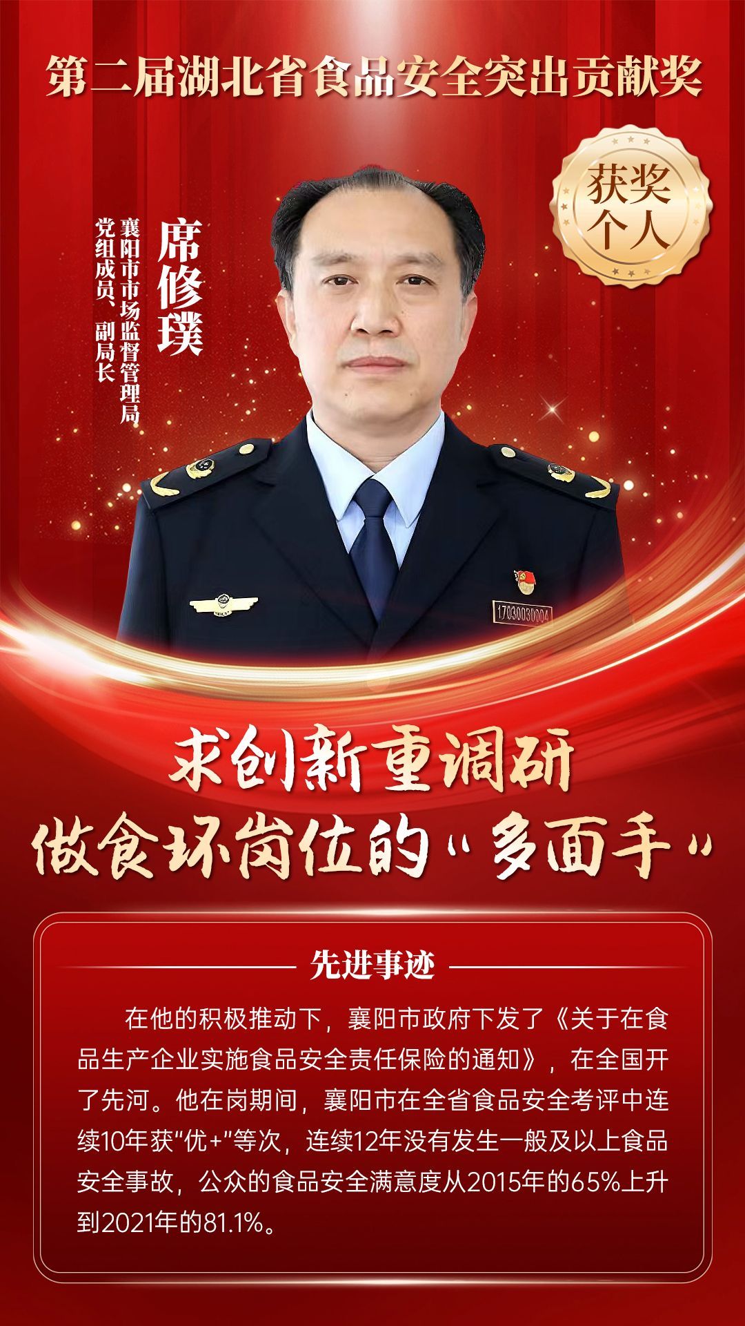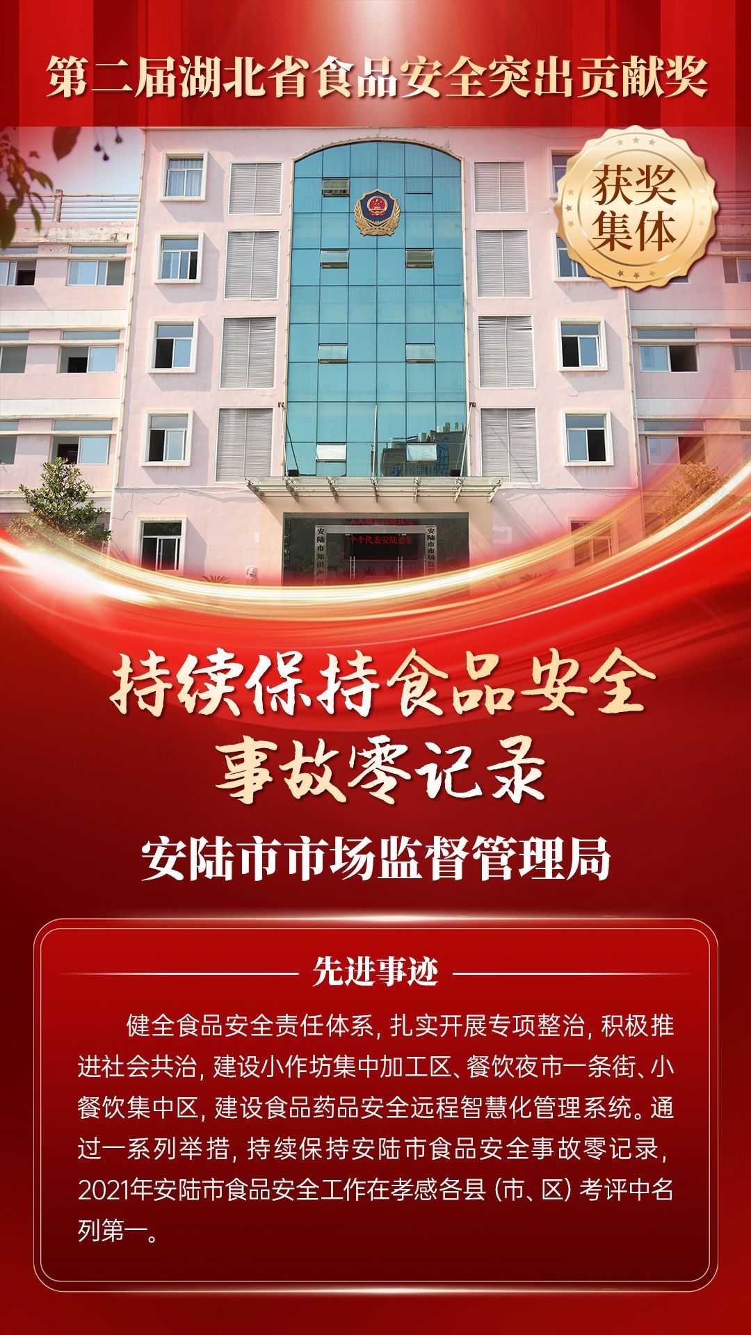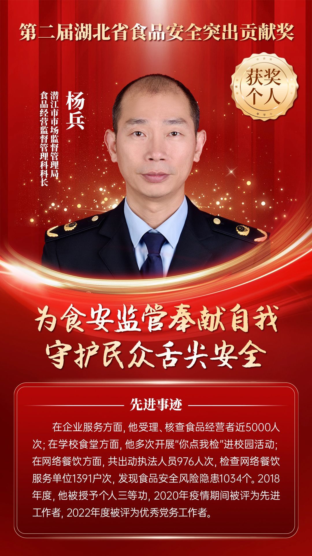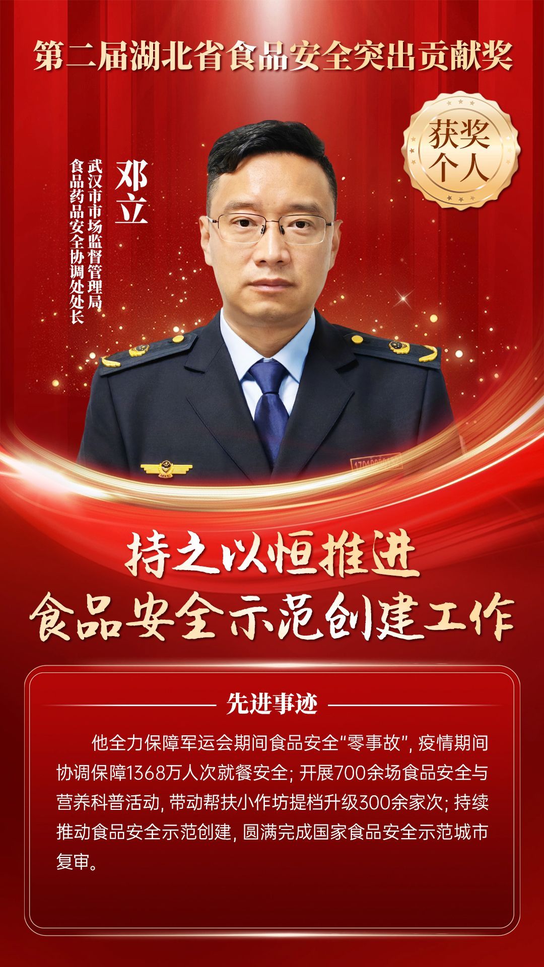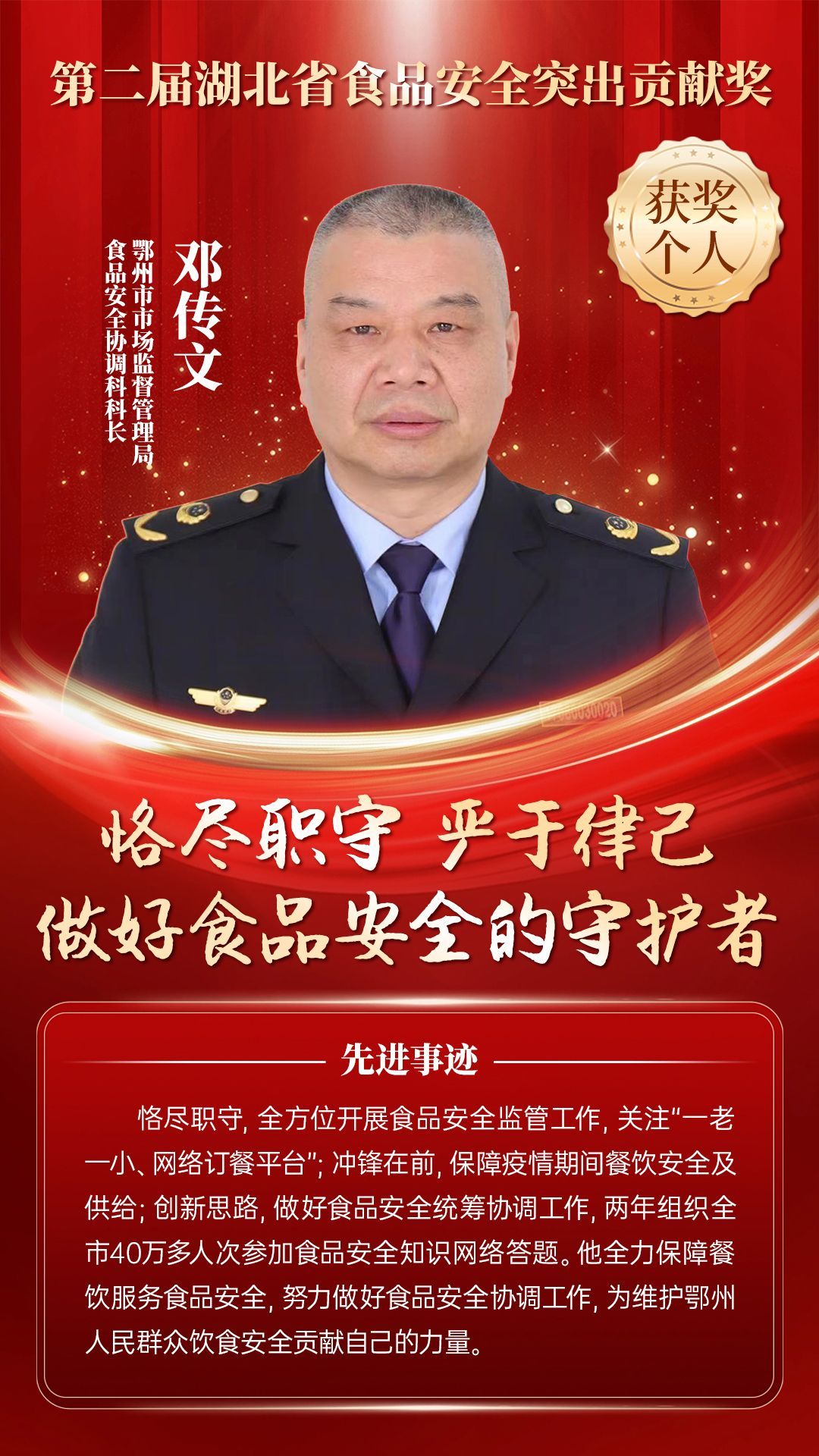 湖北省食品安全突出貢獻(xiàn)獎(jiǎng),是中央評先表彰辦公室批準(zhǔn)的全國唯一一個(gè)以“食品安全”命名的省級政府獎(jiǎng),自2021年設(shè)立以來,每三年評選一次。該獎(jiǎng)項(xiàng)主要面向食品安全工作基層一線,旨在表彰先進(jìn)典型,激勵(lì)全省食品安全工作戰(zhàn)線開拓進(jìn)取、勇于擔(dān)當(dāng)、勤勉工作,不斷提高食品安全保障水平和治理能力,堅(jiān)決筑牢食品安全底線,全力保障人民群眾“舌尖上的安全”。