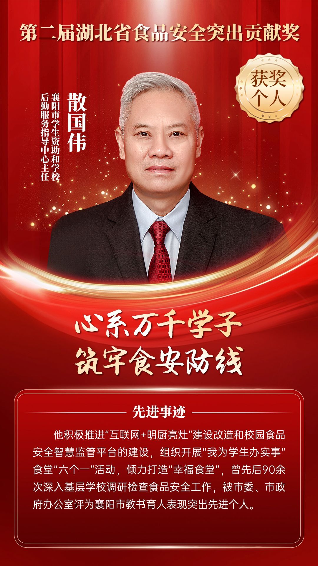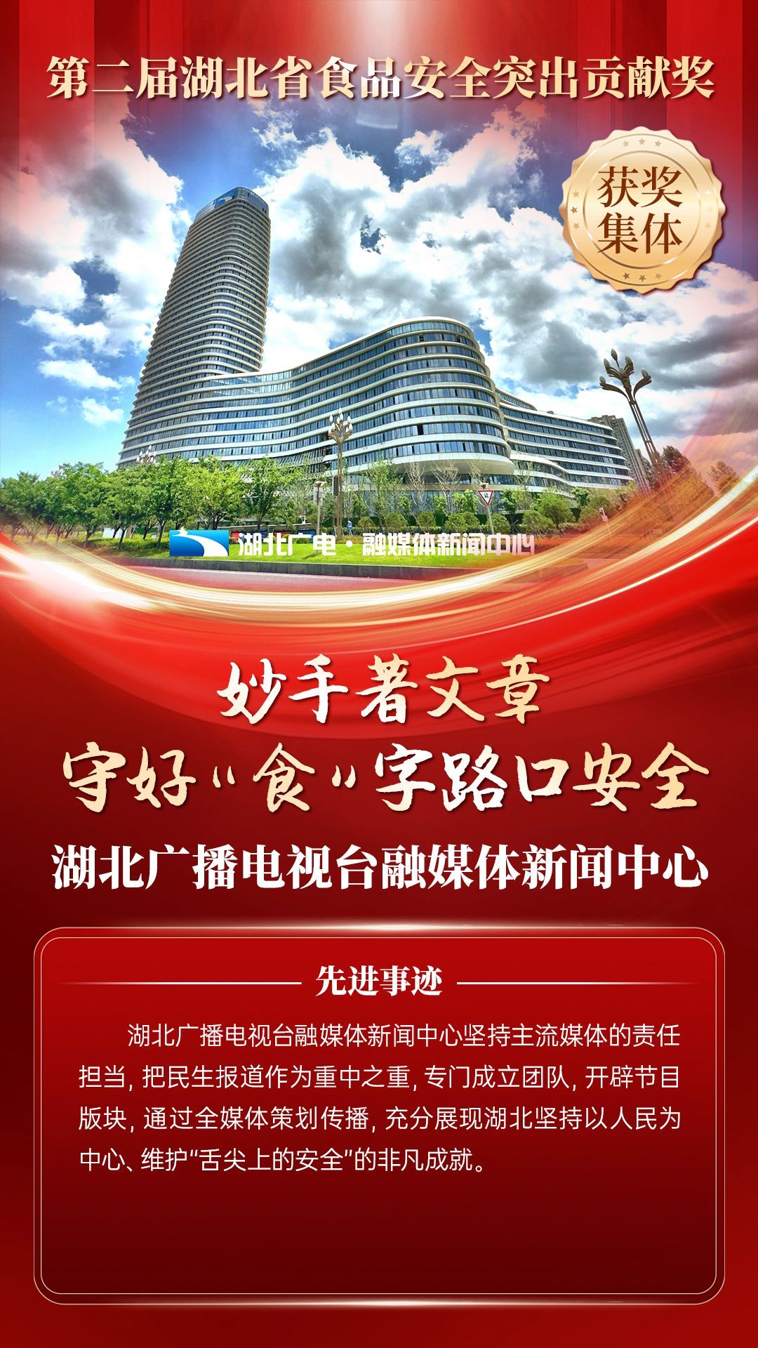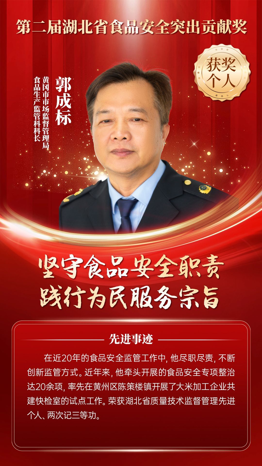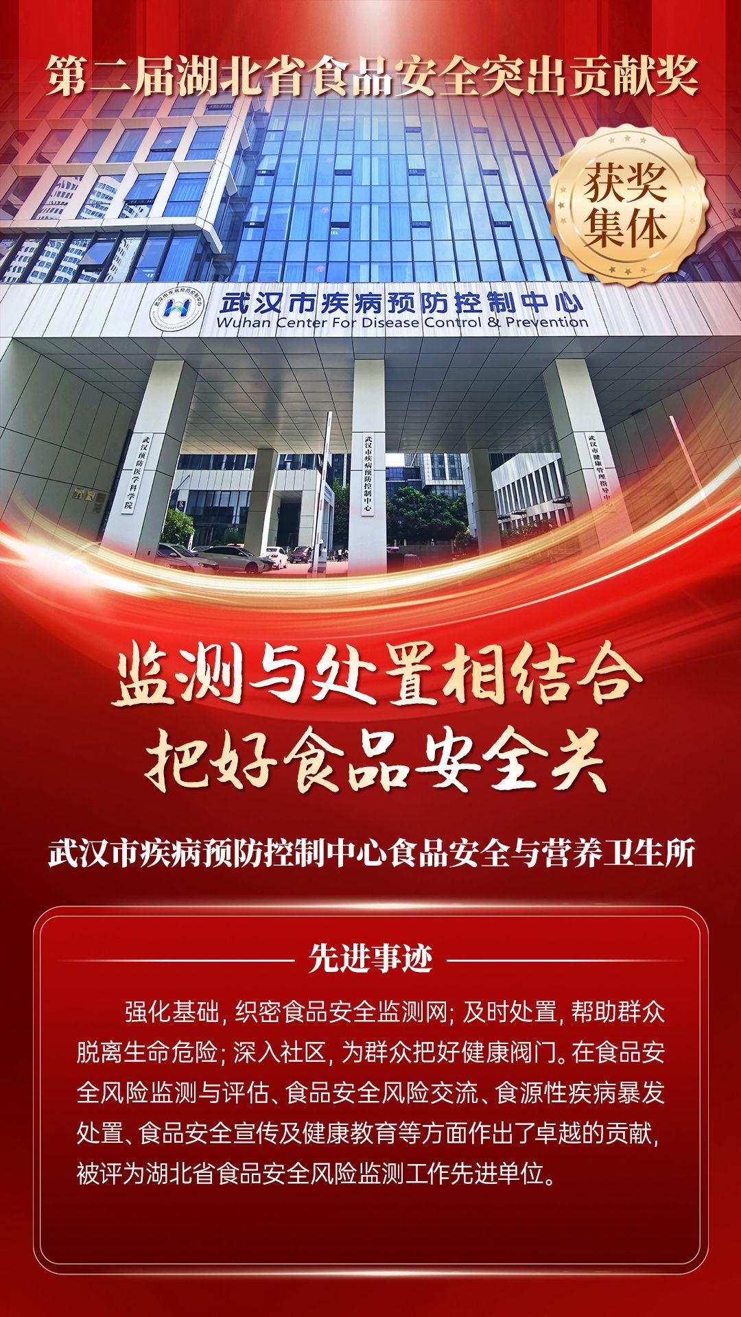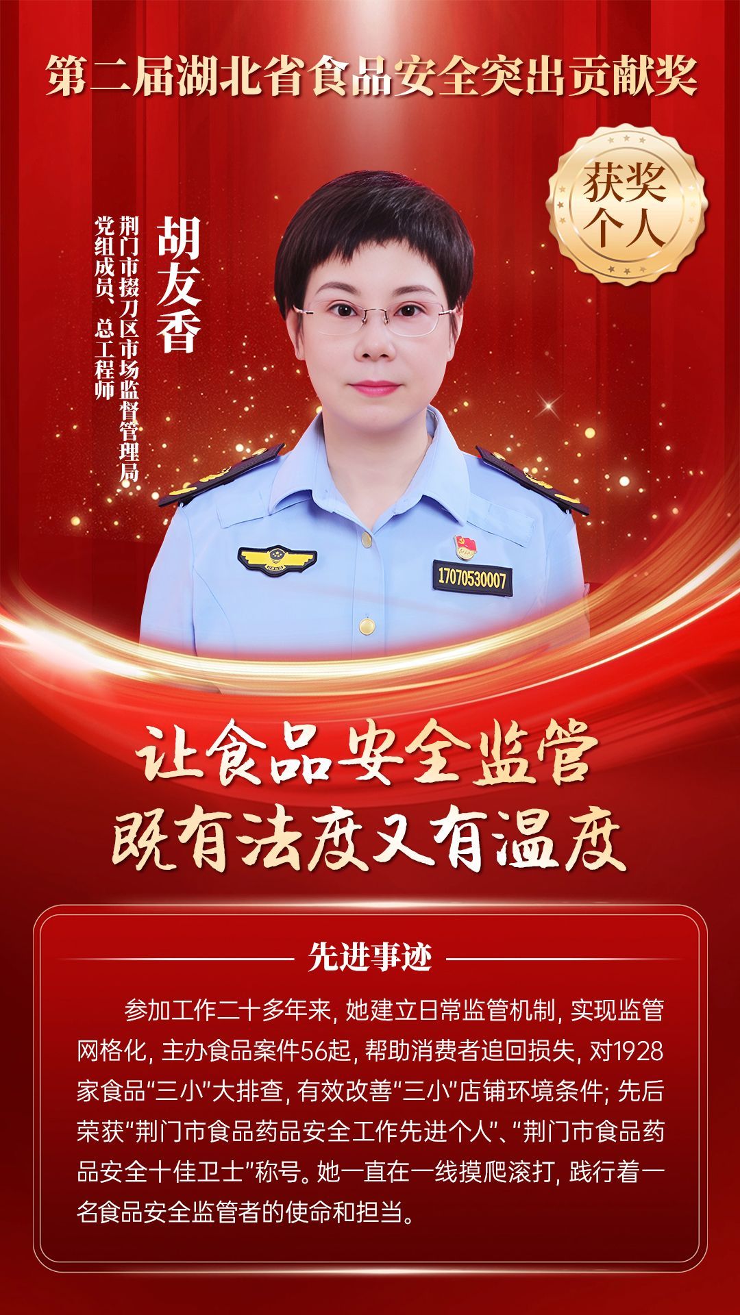 湖北省食品安全突出貢獻(xiàn)獎(jiǎng),是中央評先表彰辦公室批準(zhǔn)的全國唯一一個(gè)以“食品安全”命名的省級政府獎(jiǎng),自2021年設(shè)立以來,每三年評選一次。該獎(jiǎng)項(xiàng)主要面向食品安全工作基層一線,旨在表彰先進(jìn)典型,激勵(lì)全省食品安全工作戰(zhàn)線開拓進(jìn)取、勇于擔(dān)當(dāng)、勤勉工作,不斷提高食品安全保障水平和治理能力,堅(jiān)決筑牢食品安全底線,全力保障人民群眾“舌尖上的安全”。