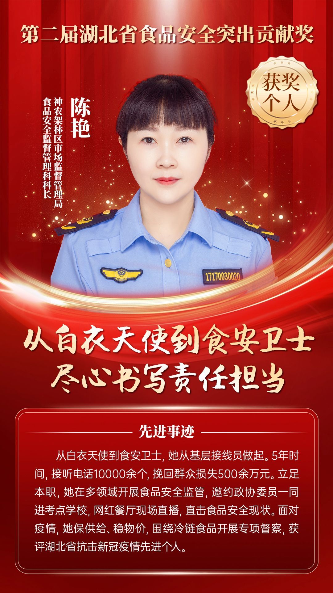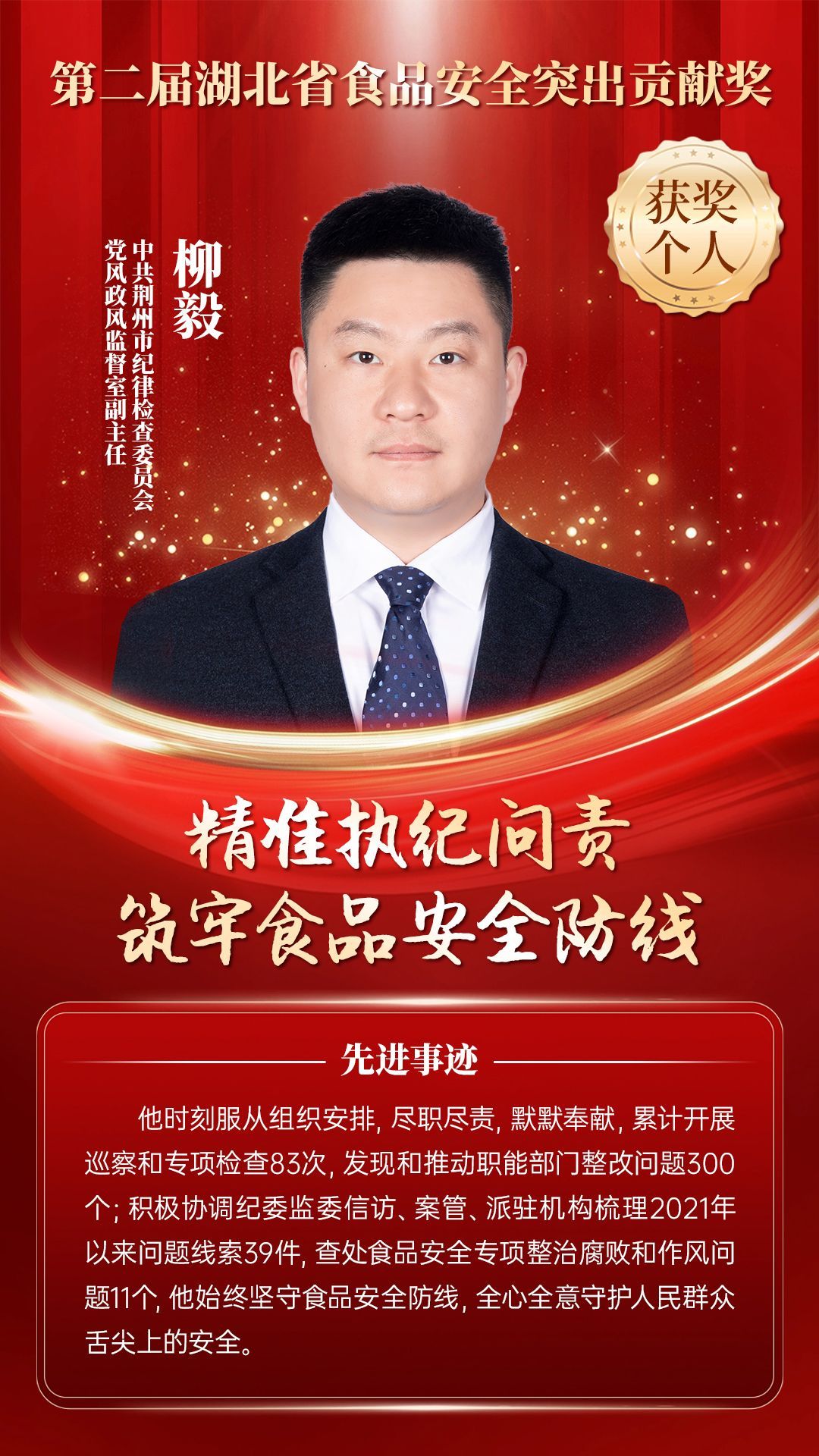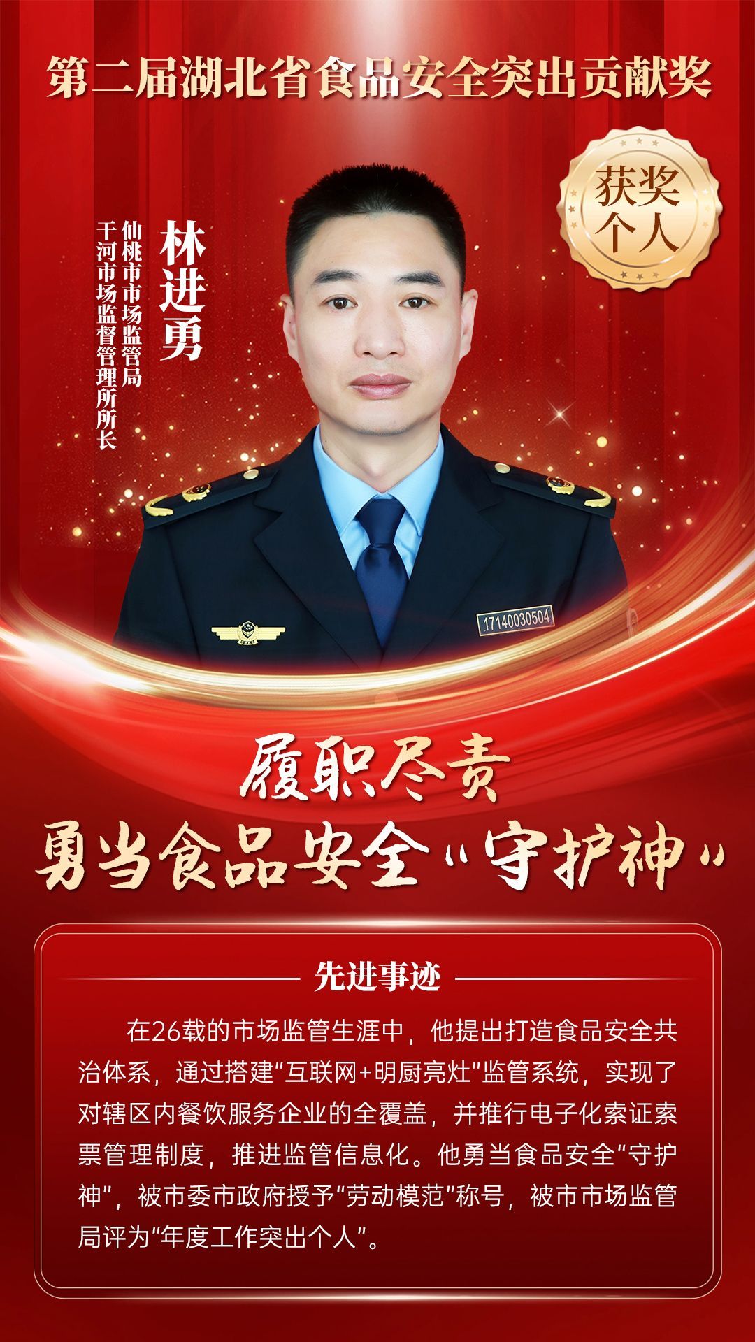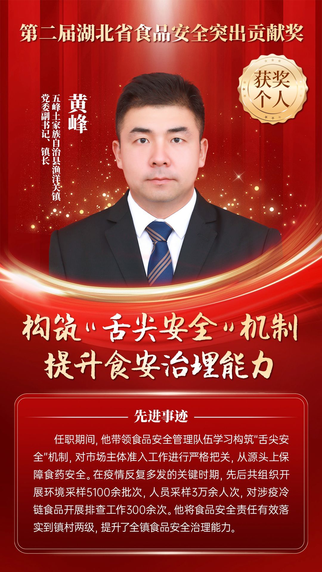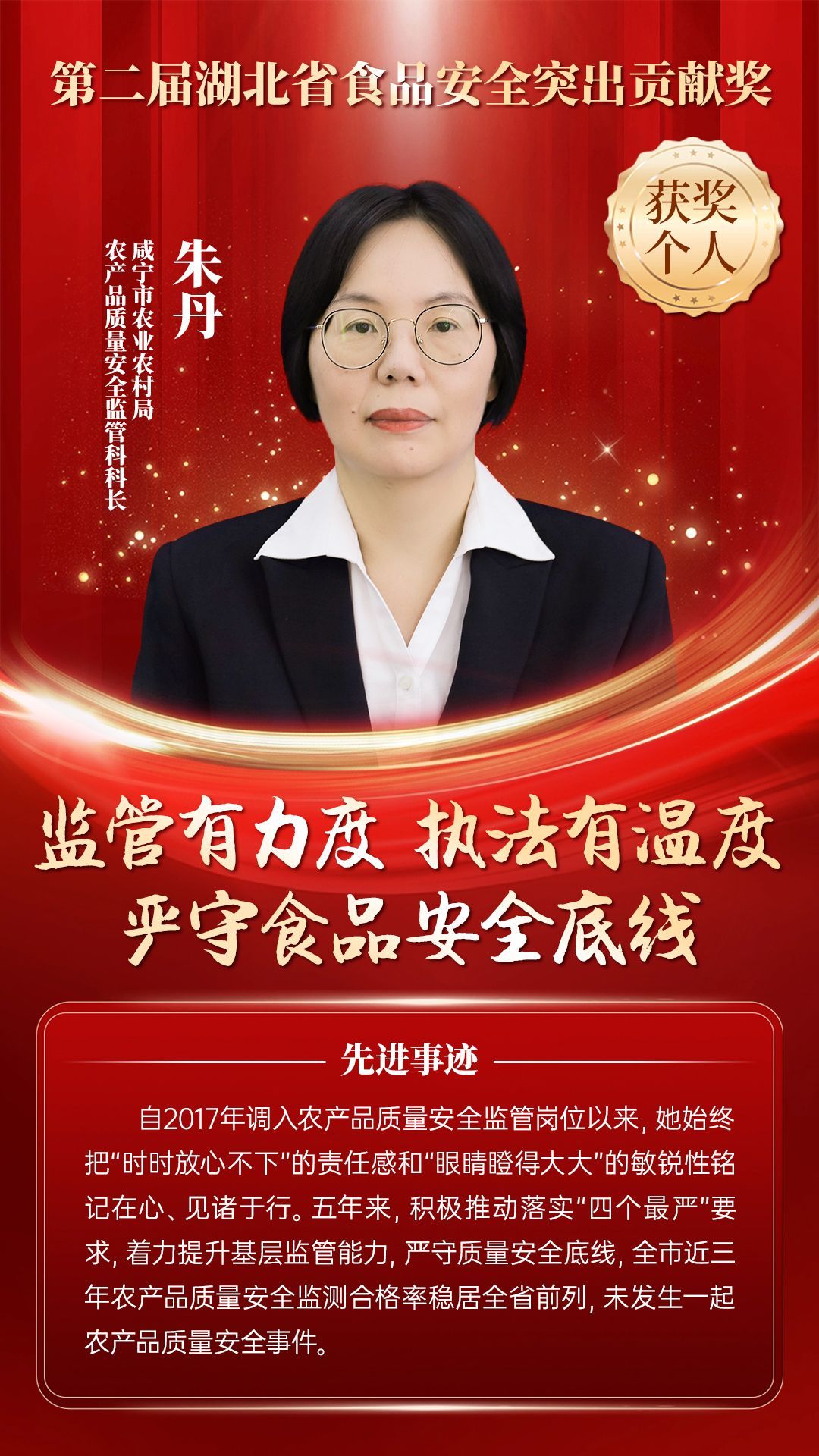 湖北省食品安全突出貢獻(xiàn)獎(jiǎng),是中央評先表彰辦公室批準(zhǔn)的全國唯一一個(gè)以“食品安全”命名的省級政府獎(jiǎng),自2021年設(shè)立以來,每三年評選一次。該獎(jiǎng)項(xiàng)主要面向食品安全工作基層一線,旨在表彰先進(jìn)典型,激勵(lì)全省食品安全工作戰(zhàn)線開拓進(jìn)取、勇于擔(dān)當(dāng)、勤勉工作,不斷提高食品安全保障水平和治理能力,堅(jiān)決筑牢食品安全底線,全力保障人民群眾“舌尖上的安全”。