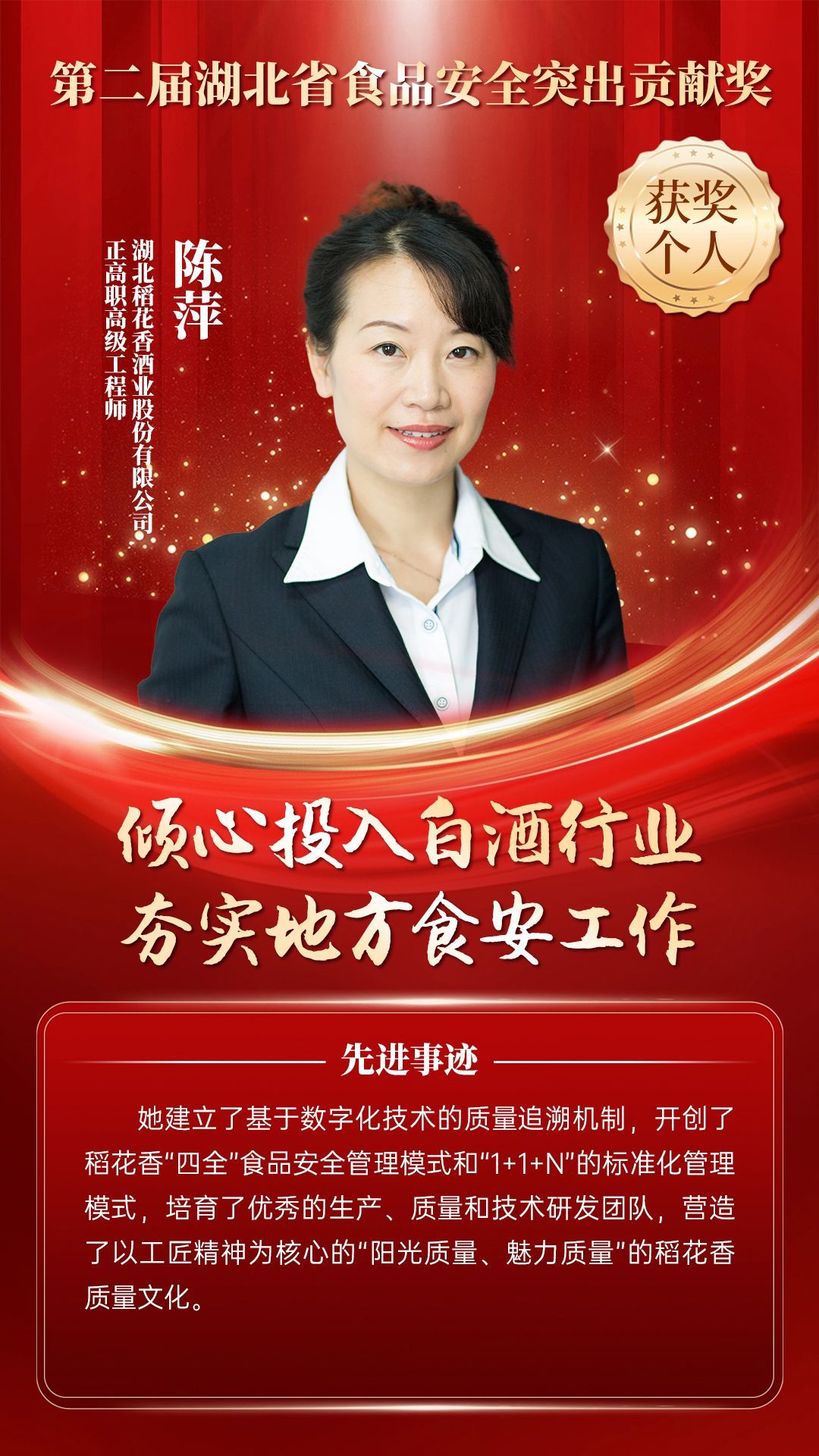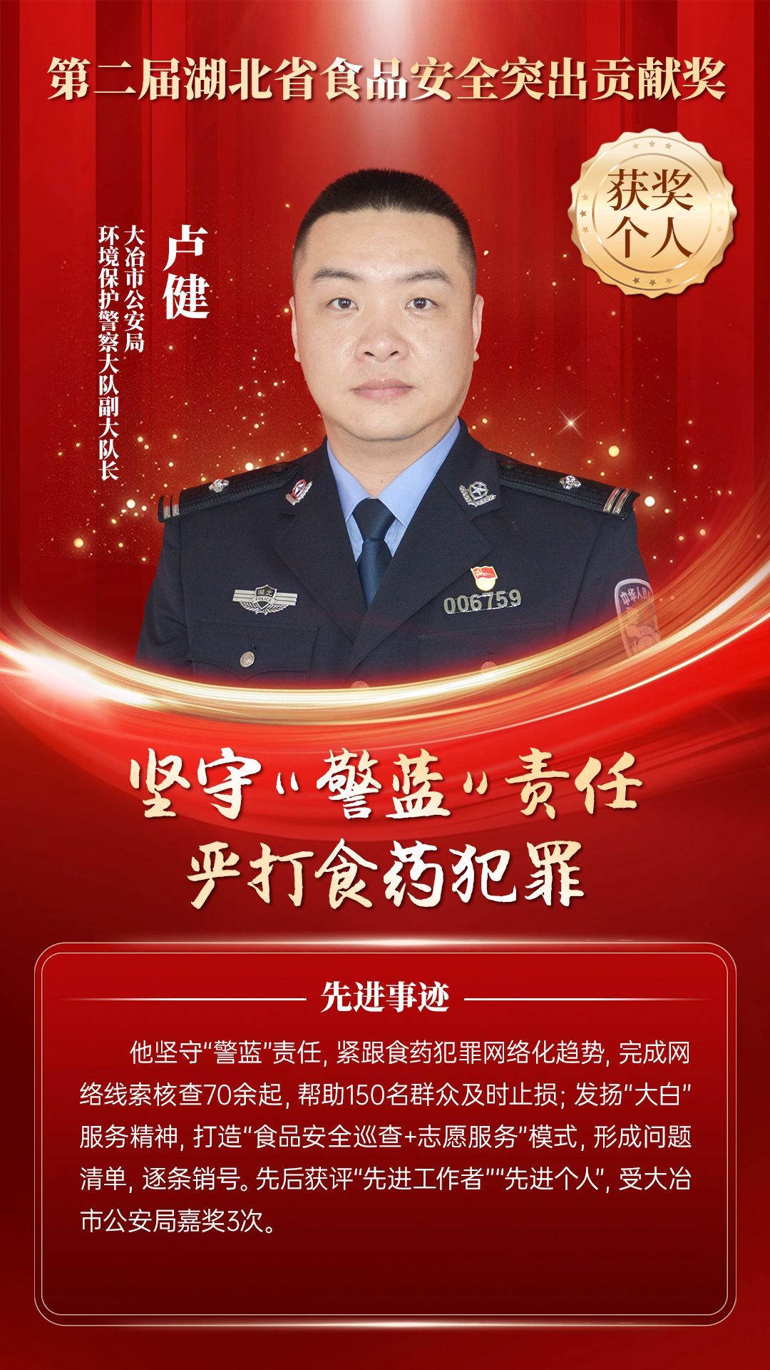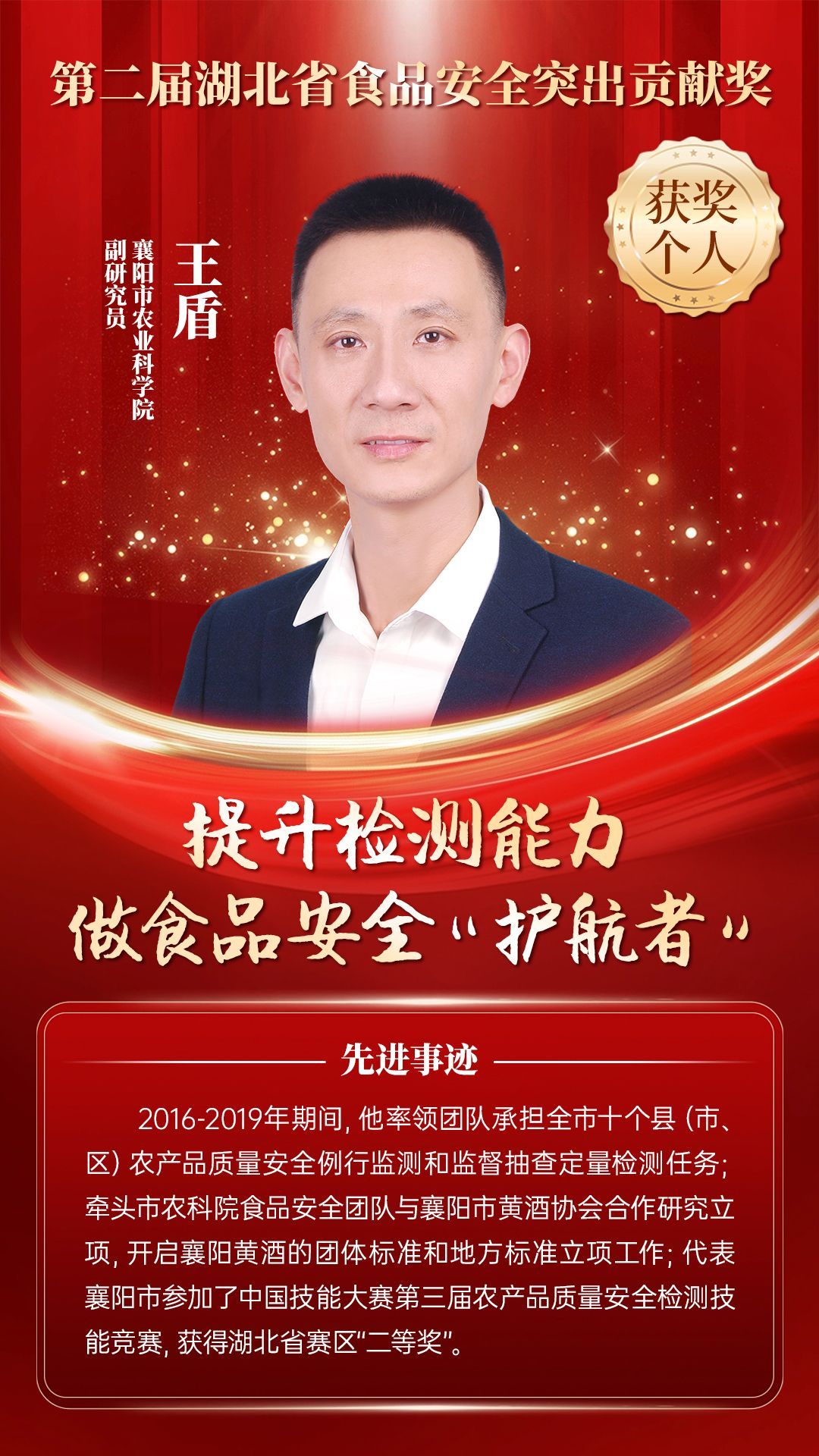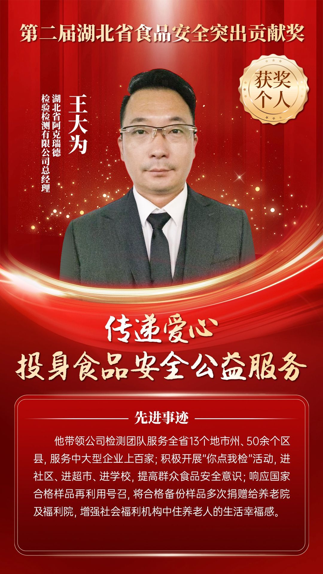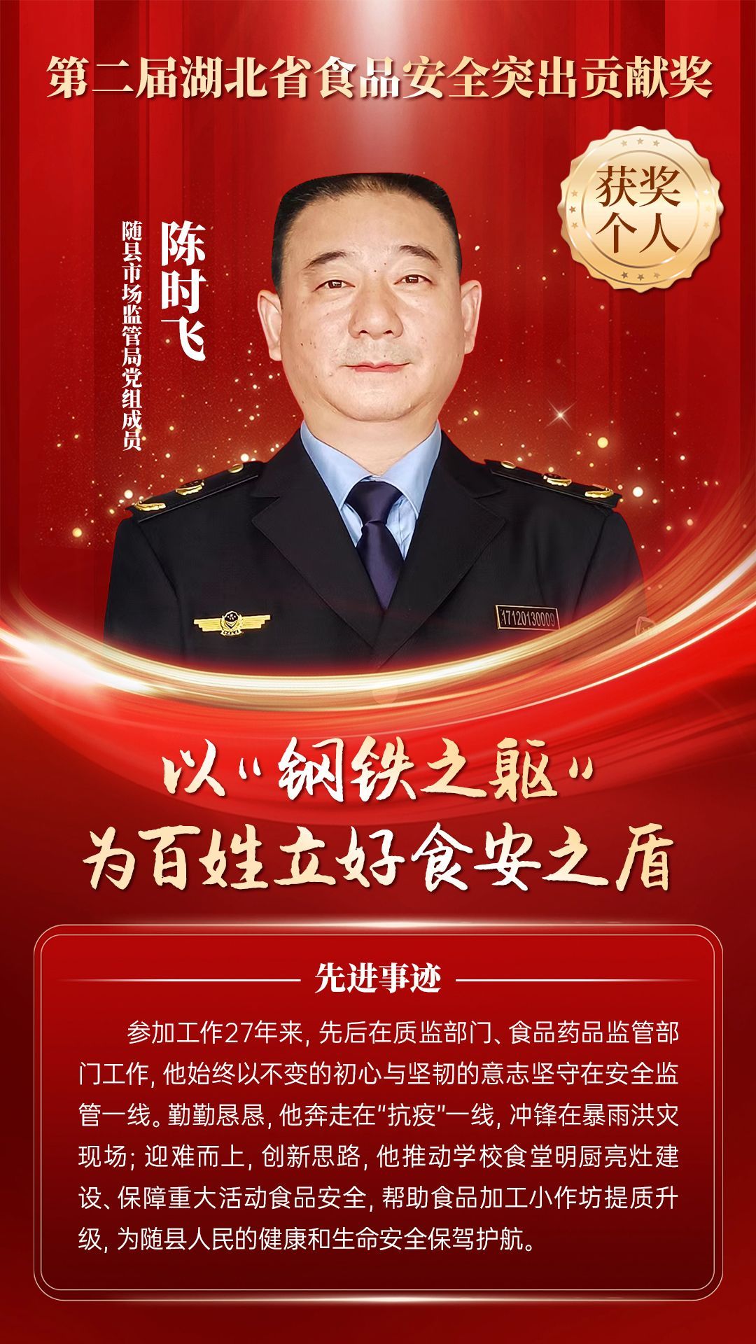 湖北省食品安全突出貢獻(xiàn)獎(jiǎng),是中央評先表彰辦公室批準(zhǔn)的全國唯一一個(gè)以“食品安全”命名的省級政府獎(jiǎng),自2021年設(shè)立以來,每三年評選一次。該獎(jiǎng)項(xiàng)主要面向食品安全工作基層一線,旨在表彰先進(jìn)典型,激勵(lì)全省食品安全工作戰(zhàn)線開拓進(jìn)取、勇于擔(dān)當(dāng)、勤勉工作,不斷提高食品安全保障水平和治理能力,堅(jiān)決筑牢食品安全底線,全力保障人民群眾“舌尖上的安全”。