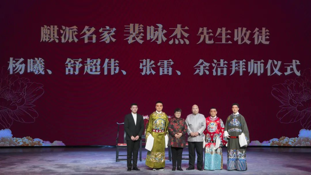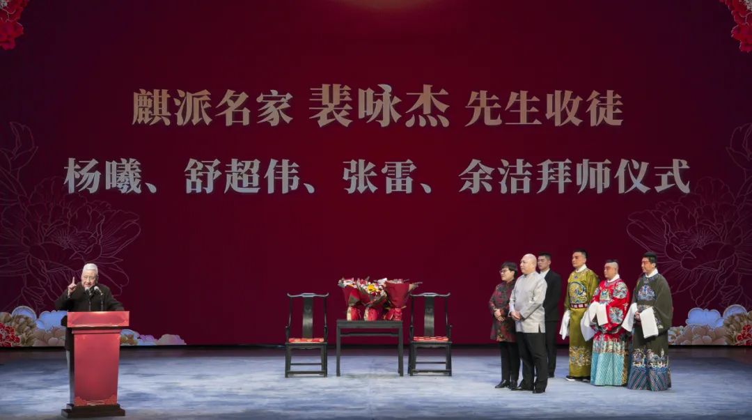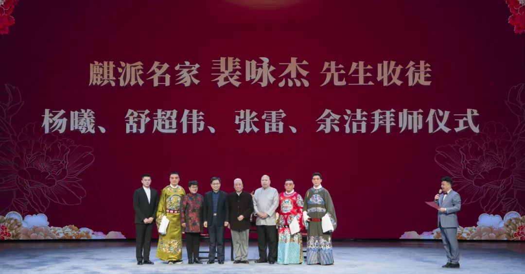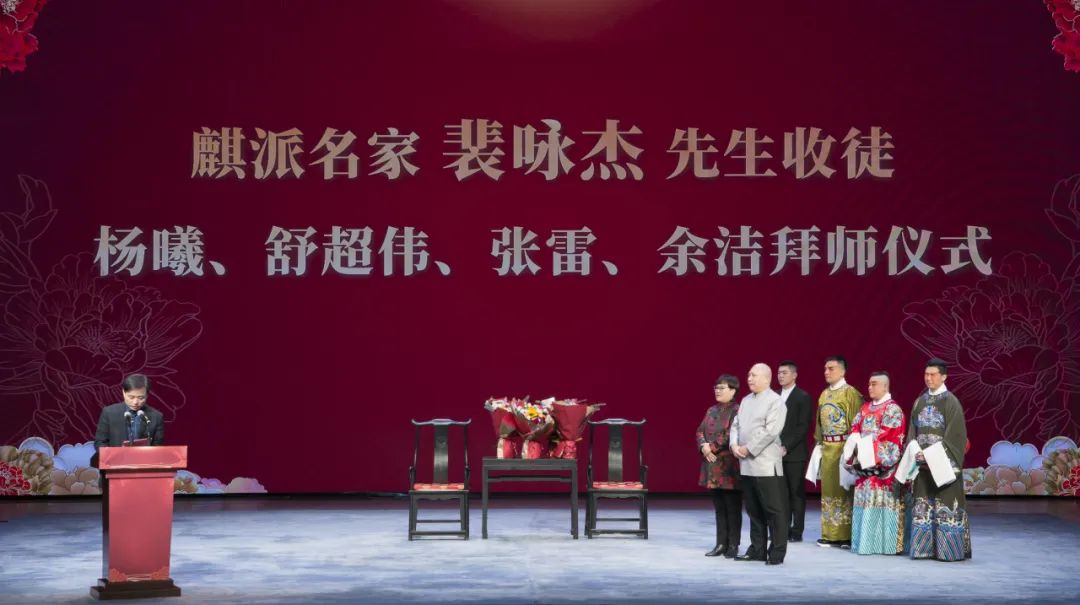 拜師儀式上,四名學(xué)生行跪拜禮,正式拜在裴詠杰先生門下,成為“麒派”第四代弟子。裴詠杰在發(fā)言中表示,“麒派”藝術(shù)是京劇流派中的瑰寶,前輩藝術(shù)家如高百歲、陳鶴峰等讓“麒派”藝術(shù)在湖北這片土地上綻放出奪目光彩,作為“麒派”演員,有責(zé)任、有義務(wù)幫助一些有條件、有追求的年輕演員們傳承這門藝術(shù)。要像自己恩師一樣,把畢生所學(xué)傾囊相授,師徒并進(jìn),不辱使命,把“麒派”藝術(shù)傳承下去并努力使之發(fā)揚(yáng)光大。省京劇院優(yōu)秀青年演員楊曦代表學(xué)生發(fā)言,感謝師父和師娘對他們師兄弟四人的諄諄教誨和關(guān)懷,今后將更加努力學(xué)習(xí)好傳承好“麒派”藝術(shù)精髓。