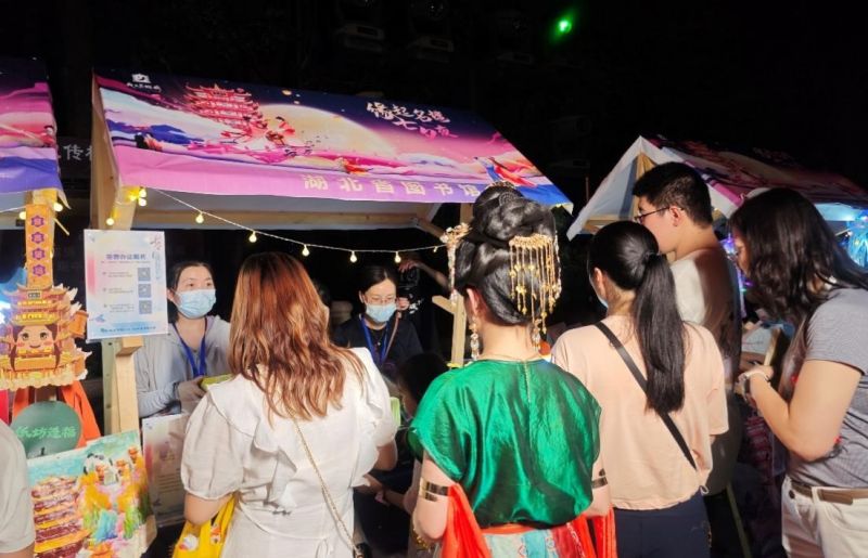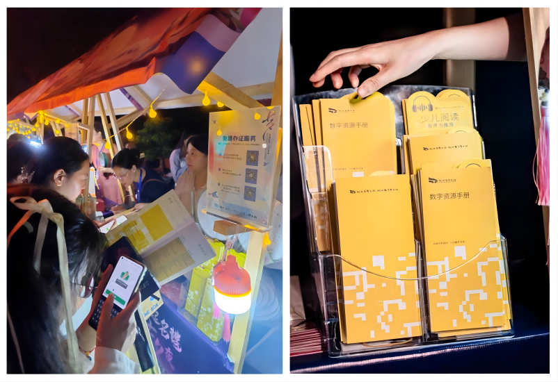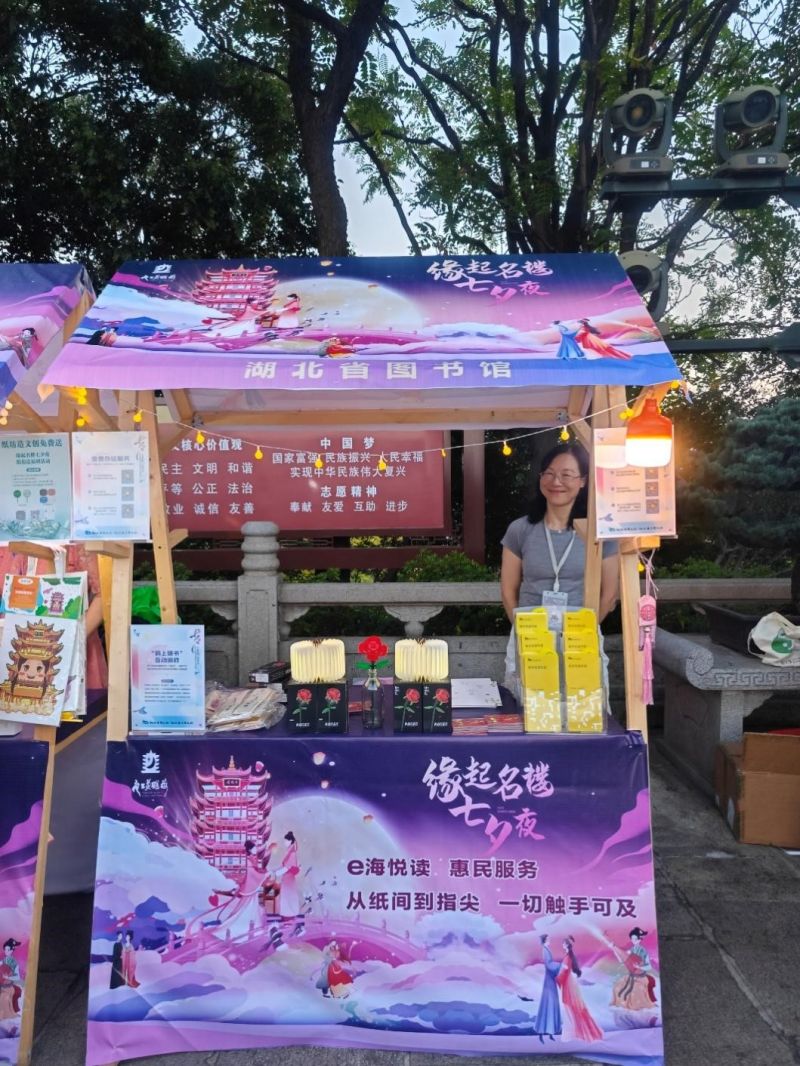 湖北省圖書館工作人員手持資源手冊(cè)向游客熱情介紹湖北數(shù)字圖書館的豐富數(shù)字資源,引導(dǎo)市民現(xiàn)場免費(fèi)辦理電子讀者證,組織現(xiàn)場情侶參與碼上猜書互動(dòng)游戲,讓他們?cè)谳p松愉快的氛圍中感受到 “從紙間到指尖,一切觸手可及”的數(shù)智魅力?;顒?dòng)現(xiàn)場,工作人員還向體驗(yàn)服務(wù)、參與游戲的游客贈(zèng)送書簽、書燈、積木玫瑰等紀(jì)念品,為他們帶去美好的七夕祝福。