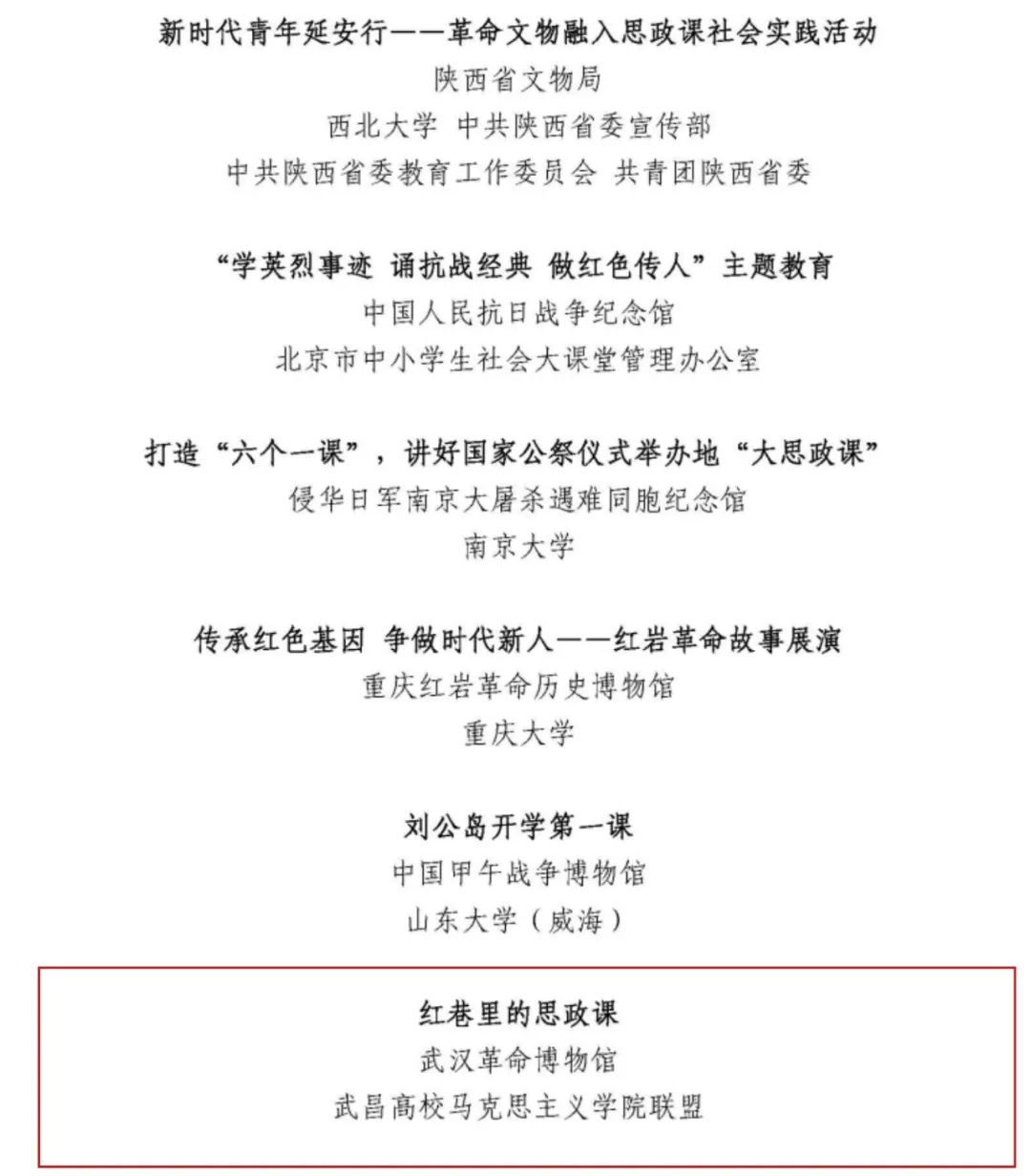 此外,湖北省還有五個項目入選以革命文物為主題的“大思政課”優(yōu)質(zhì)資源精品項目名單(100 項)。