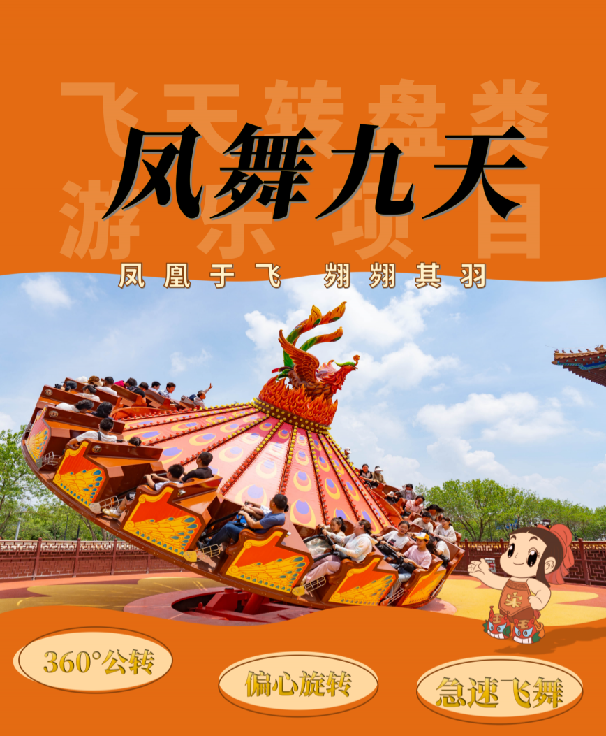 “鳳舞九天”游樂項(xiàng)目,不僅外觀精美,而且體驗(yàn)感極強(qiáng)!座艙在360°公轉(zhuǎn)的同時又有規(guī)律地偏心旋轉(zhuǎn),讓游客擁有如鳳凰飛翔般的非凡體驗(yàn)。