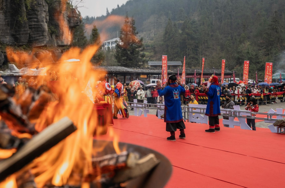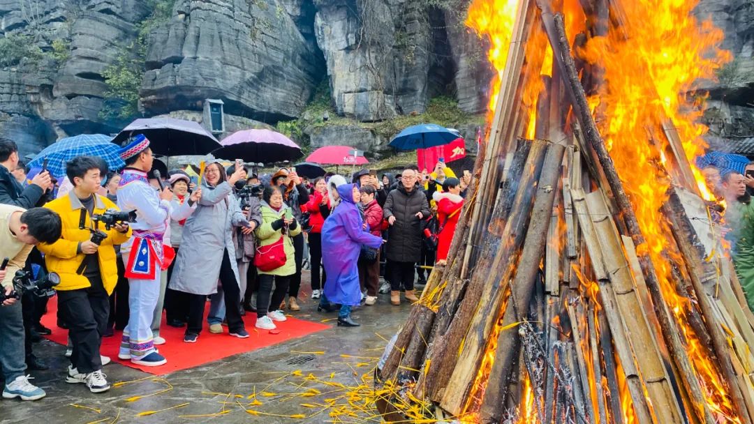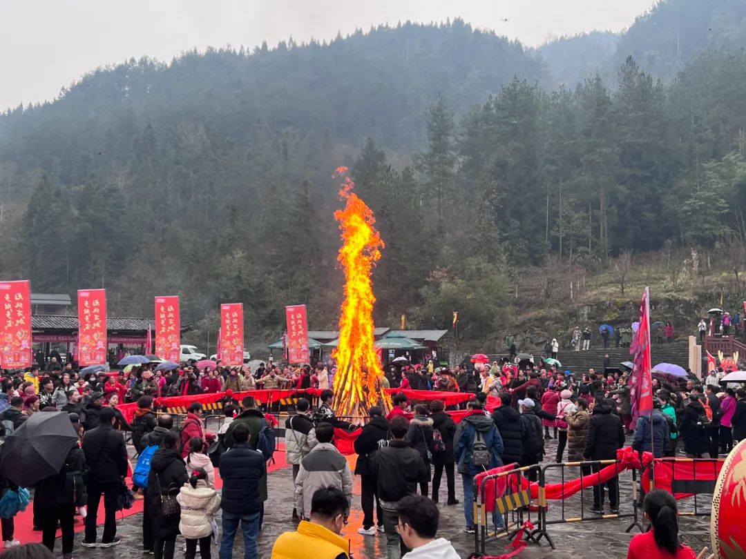 土家梯瑪(祭司)點燃了篝火,發(fā)放金穗,祈愿來年風調(diào)雨順、年年有余。這熊熊篝火象征著新年的希望,現(xiàn)場的游客和村寨民眾一起感受著神秘的土家文化和年俗,共同祈福,共享民族大融合。