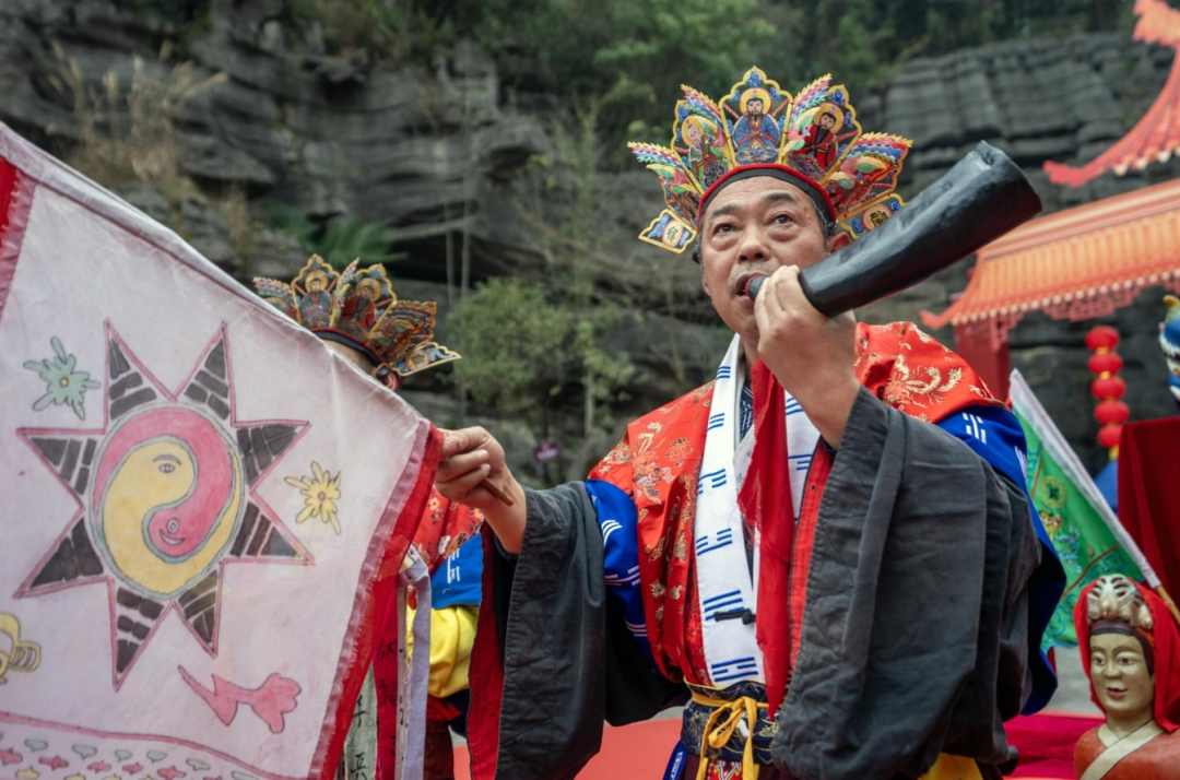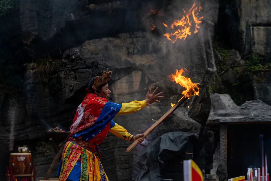 廟會的開寨祈福儀式是開幕式的焦點,分為土鼓苗歌迎賓、土家非遺儺戲和茅古斯祈福等環(huán)節(jié),展現(xiàn)了豐富的民俗表演?,F(xiàn)場游客應接不暇,陶醉在劇情沉浸式的演出中。