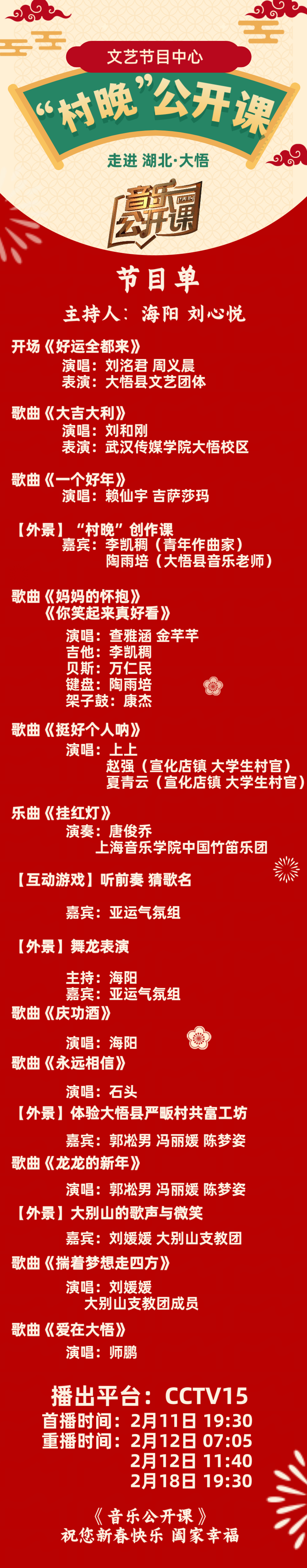 此次節(jié)目集中在大悟縣宣化店鎮(zhèn)、劉集鎮(zhèn)、武漢傳媒學(xué)院大悟校區(qū)、思源學(xué)校等地錄制,劉和剛、師鵬、石頭等知名歌手激情演唱,與大悟父老鄉(xiāng)親同慶新春佳節(jié)。大悟縣360多名非遺傳承人、音樂人、學(xué)生、基層干部也參與了節(jié)目錄制。