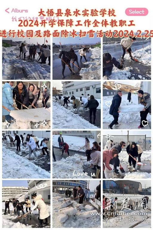 2月25日至26日,大悟中職校、思源實驗學校、縣直機關(guān)幼兒園組織、縣泉水實驗學校分別組織全校教職工對學校大門口、校園內(nèi)各主干道、階梯等重點通行路段進行了掃雪除冰,讓校區(qū)的道路變得暢通,干凈清潔,為師生返校營造安全、整潔、幸福的環(huán)境。
