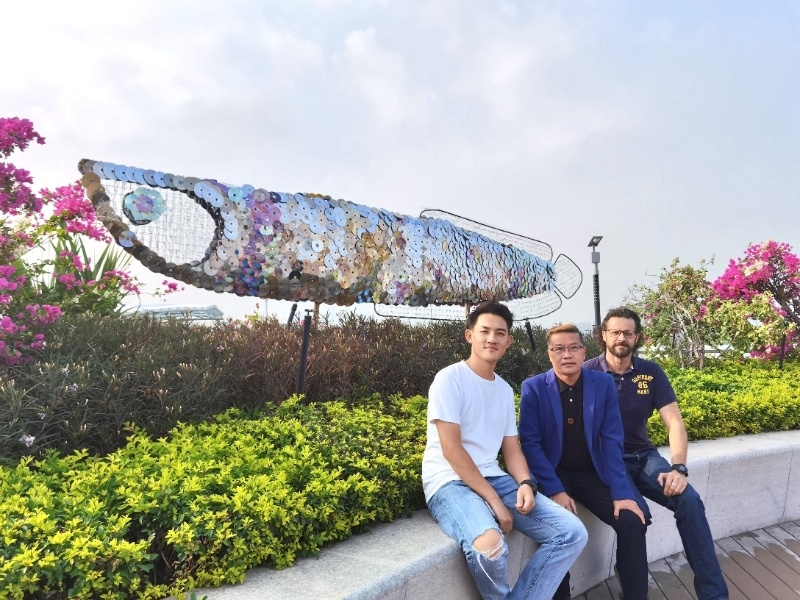 菲律賓藝術(shù)家波·安茲(左二)與友人在可回收垃圾制作的大型藝術(shù)裝置前。受訪者供圖