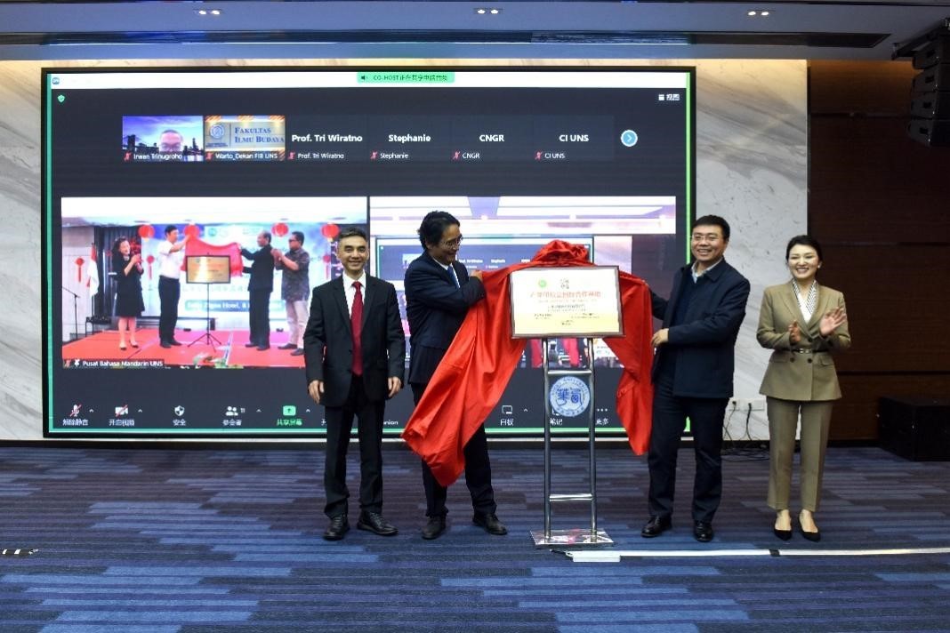 合作方代表為“產(chǎn)學(xué)研校企國(guó)際合作基地”揭牌。印尼三一一大學(xué)孔子學(xué)院供圖